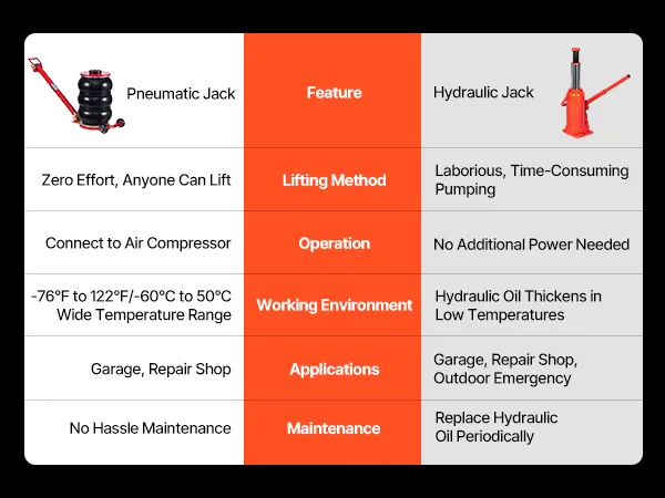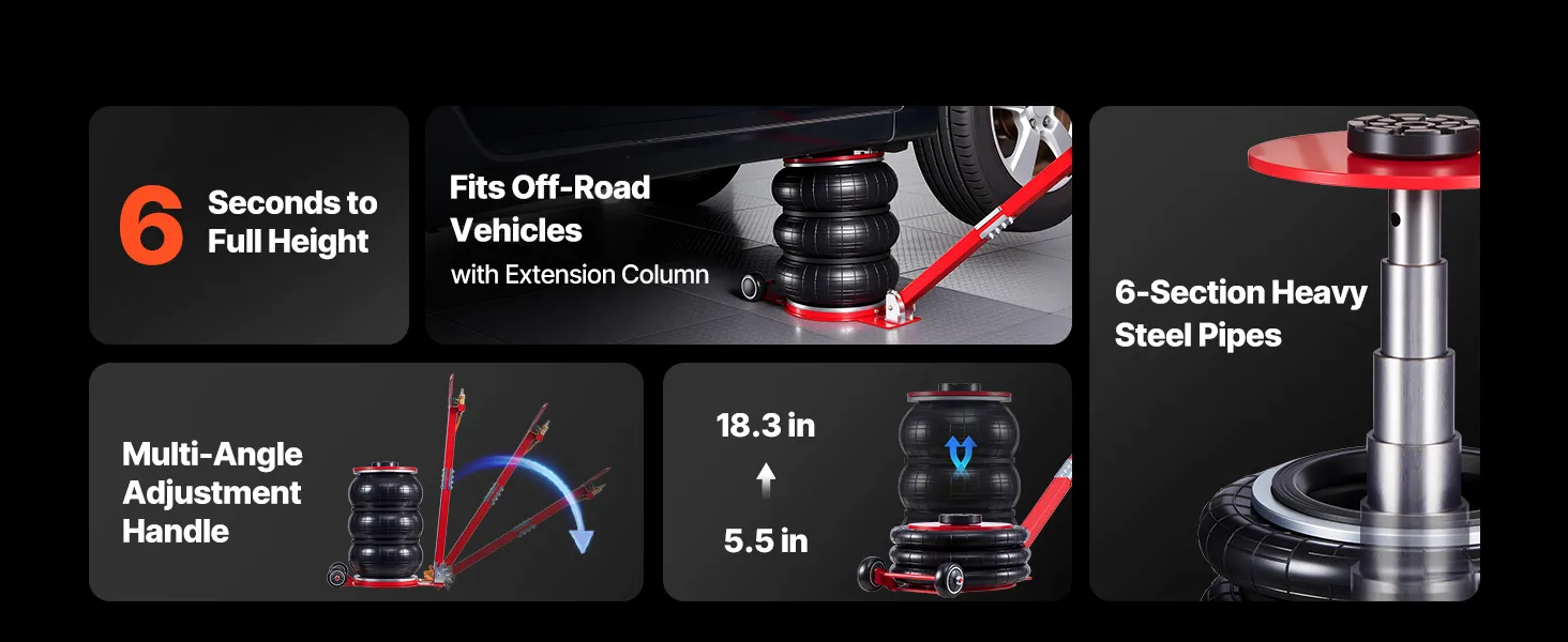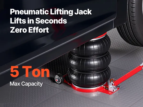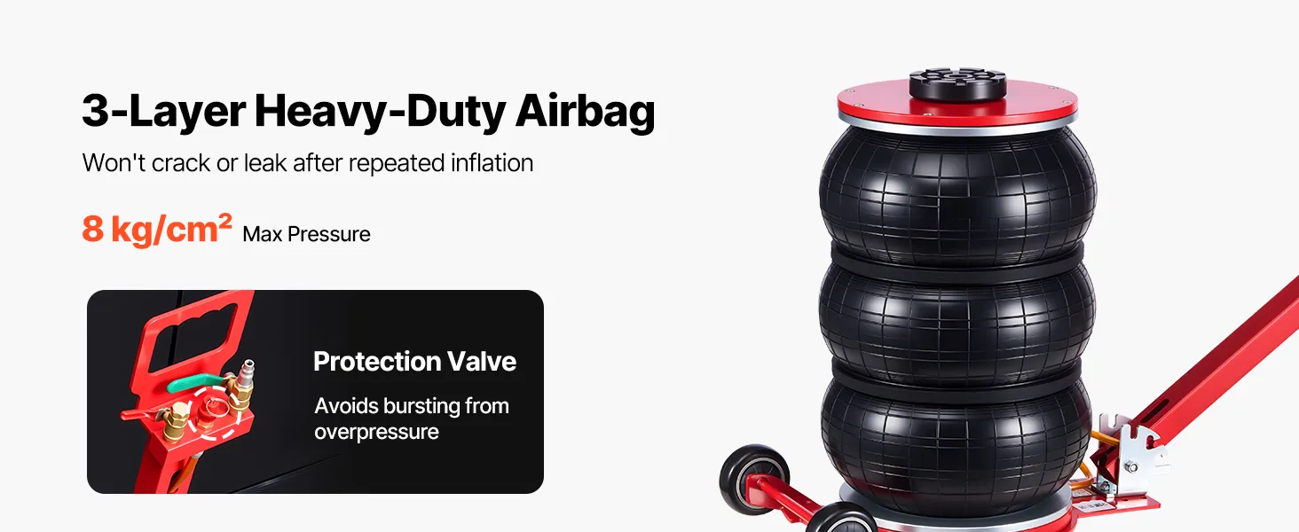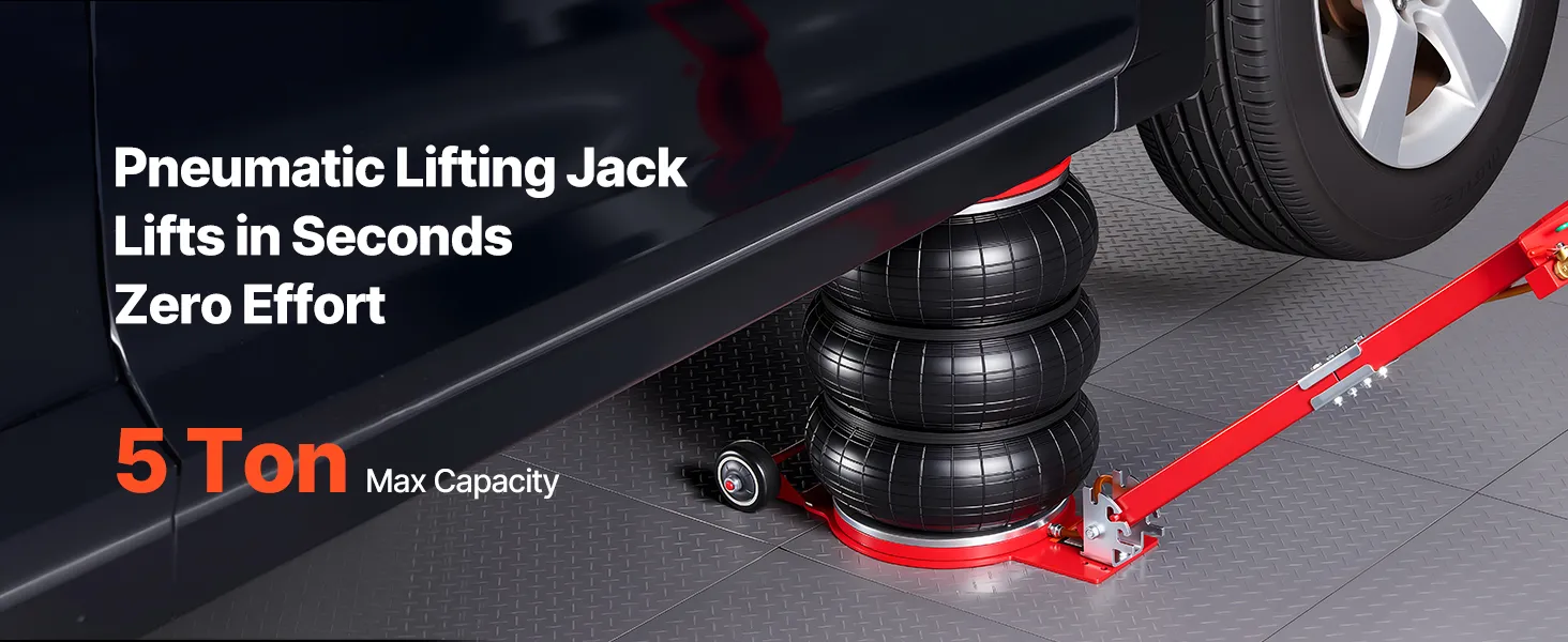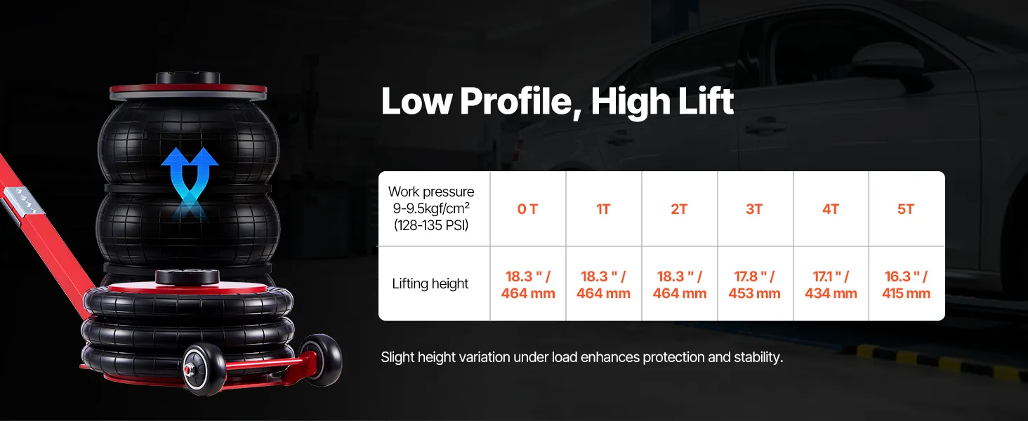Hefvermogen van 5 ton: Deze pneumatische krik kan tot 5 ton (11.023 lbs) tillen en is geschikt voor personenauto's, SUV's, pick-ups en vrachtwagens. De versterkte, drielaagse luchtveringbalg en de verbrede bodemplaat zorgen voor een krachtige en stabiele hefwerking.