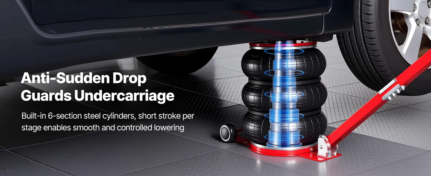 Gecontroleerd en veilig laten zakken: De pneumatische krik is voorzien van zes robuuste stalen buizen, elk met een kortere slag, voor een soepele, gelijkmatige verlaging en nauwkeurige hoogteregeling. Dit voorkomt abrupt zakken, verdeelt het gewicht gelijkmatig en voorkomt vervorming of kantelen.
