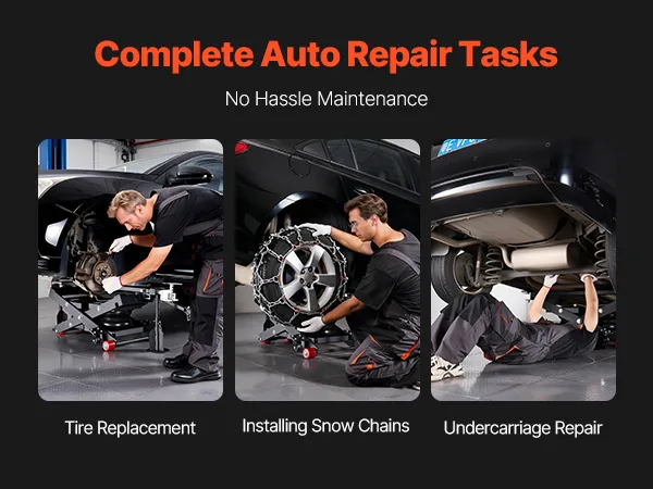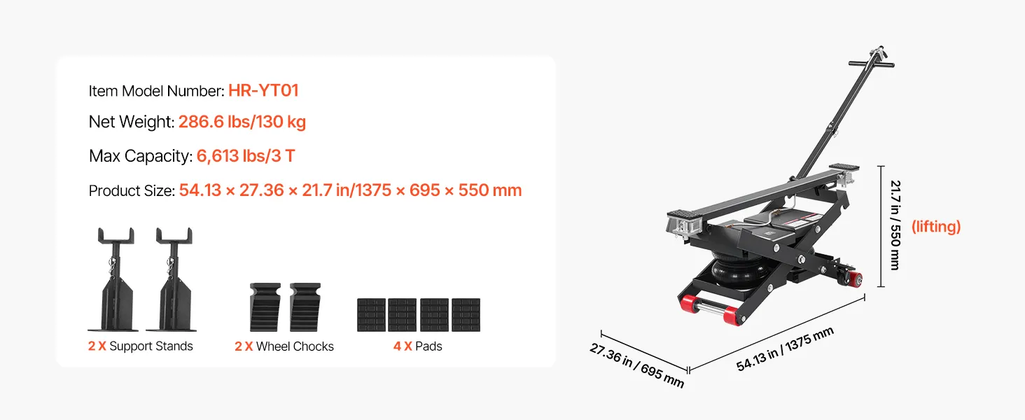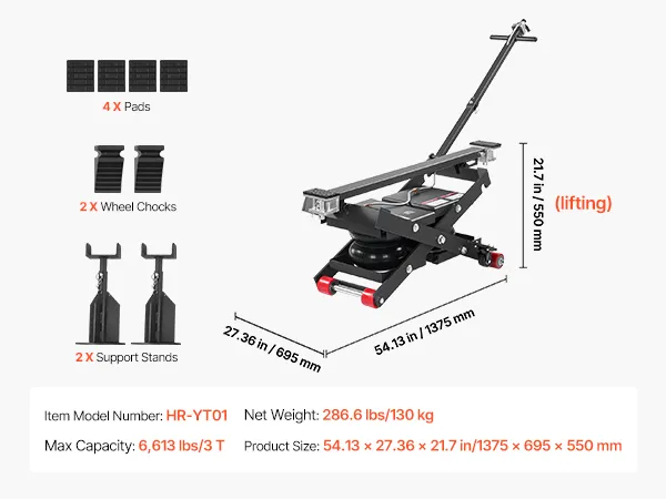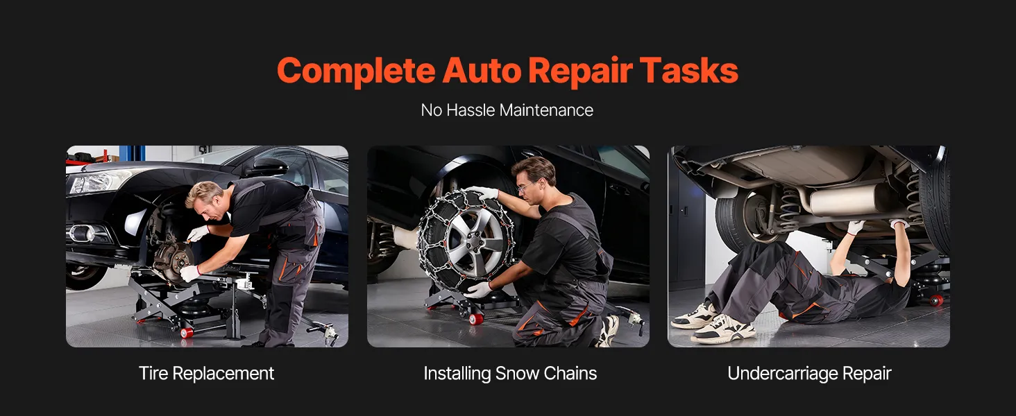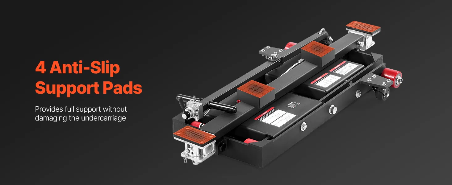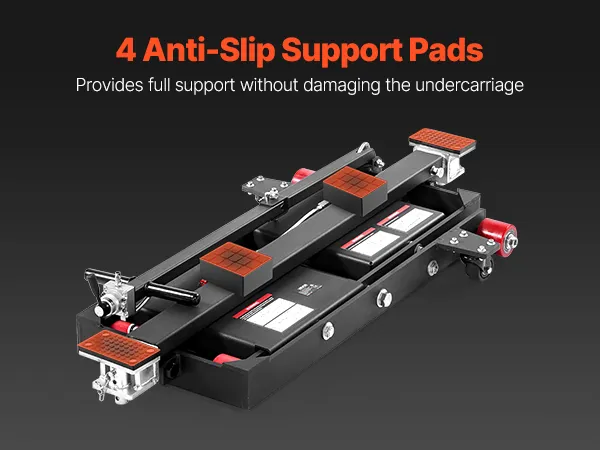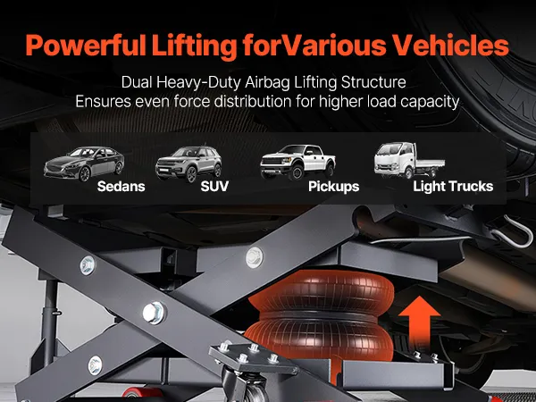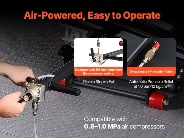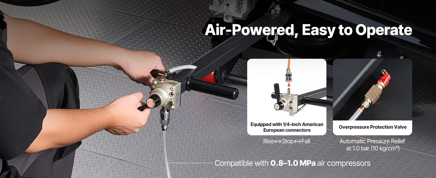 Veilige voertuigondersteuning: De bovenkant van de mobiele hefbrug is voorzien van vier rubberen pads die stevig op de contactpunten van het voertuig aansluiten, waardoor een slipvrije en chassisbeschermende grip gegarandeerd is. Het ventiel is voorzien van 1/4-inch koppelingen (VS en EU) en is compatibel met luchtcompressoren van 0,8–1,0 MPa.