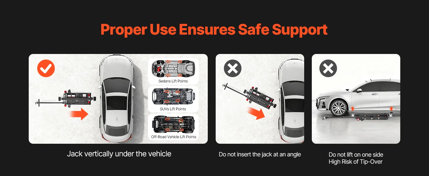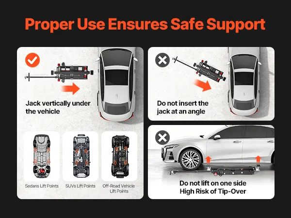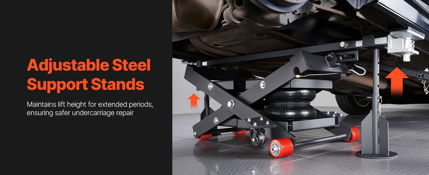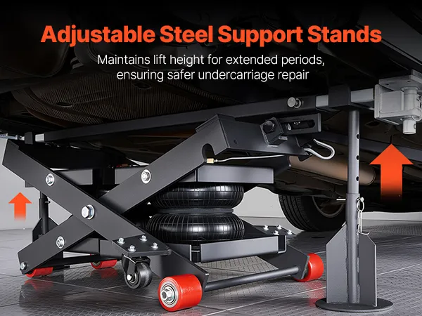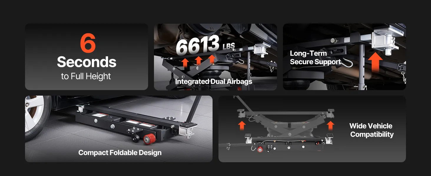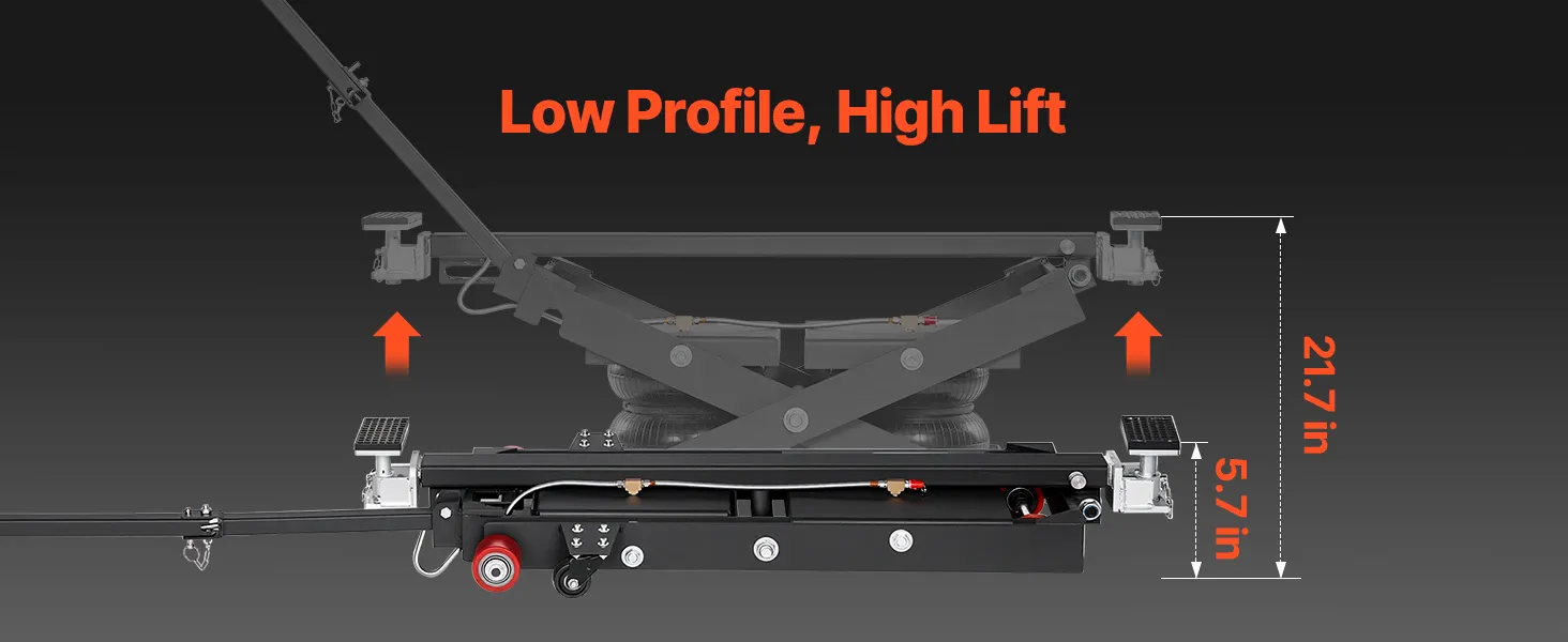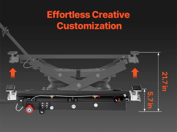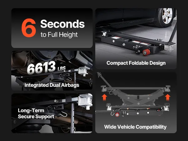 Geschikt voor elk voertuig: De draagbare luchtlift tilt voertuigen op van 145 tot 550 mm (5,7 tot 21,7 inch) hoogte en is in breedte verstelbaar van 1375 tot 1985 mm (54,1 tot 78,2 inch). De in 4 standen verstelbare steunbalk kan tot 610 mm (24 inch) worden ingeklapt om verschillende voertuighoogtes en reparatiebehoeften te kunnen accommoderen.