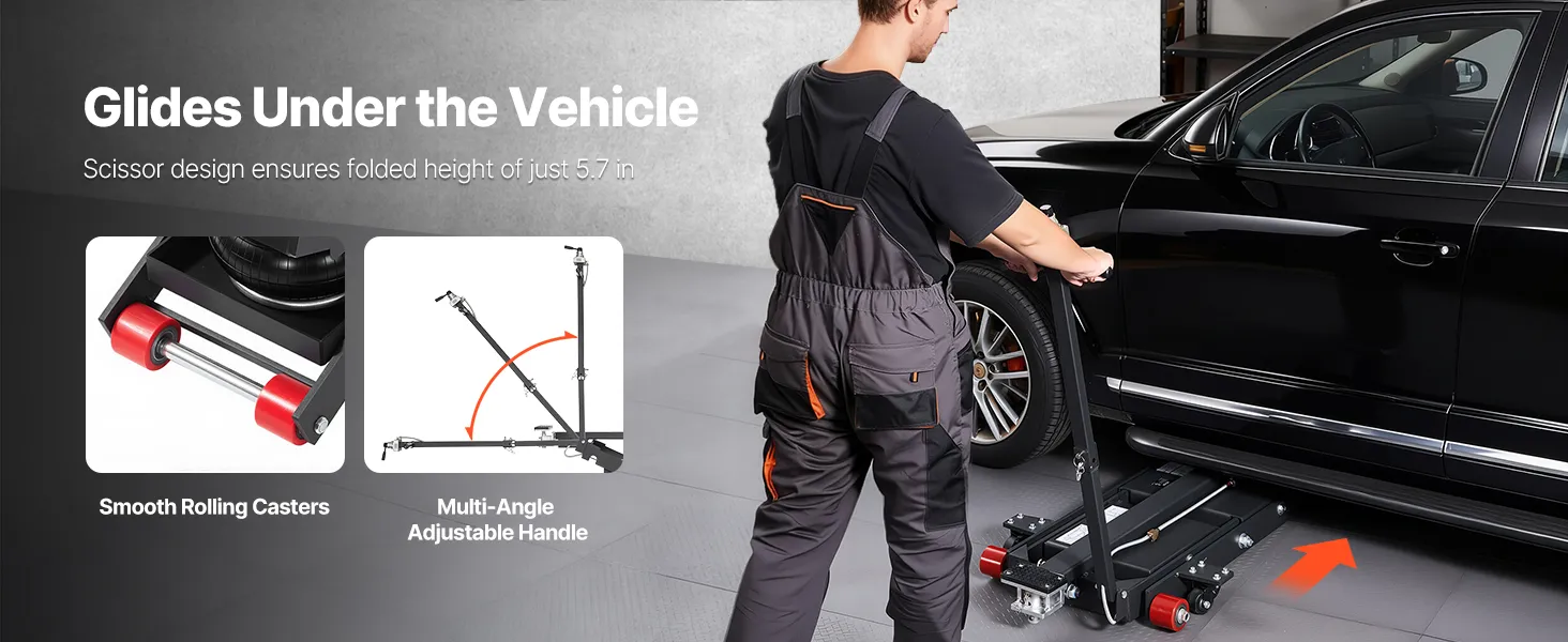 Moeiteloos manoeuvreren onder voertuigen: dankzij het schaarframe en het lage profiel in opgevouwen toestand glijdt de pneumatische hefbrug gemakkelijk onder voertuigen. De verstelbare handgreep en wielen maken een snelle en moeiteloze positionering op het hefpunt mogelijk.