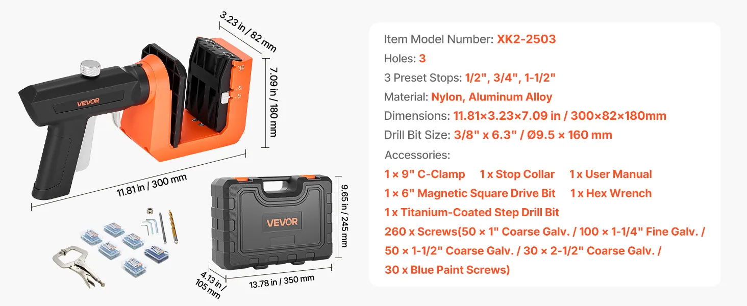 VEVOR Pocket Hole Jig, Pocket Hole boormalset, 12,7, 19, 38,1 mm, 360° draaibare handgreep, 260 schroeven, C-klem, aanslagring, boortjes, eenvoudig klemmen en afstellen, voor houtbewerking VEVOR Pocket Hole Jig, Pocket Hole boormalset, 12,7, 19, 38,1 mm, 360° draaibare handgreep, 260 schroeven, C-klem, aanslagring, boortjes, eenvoudig klemmen en afstellen, voor houtbewerking