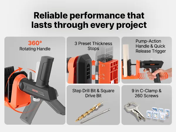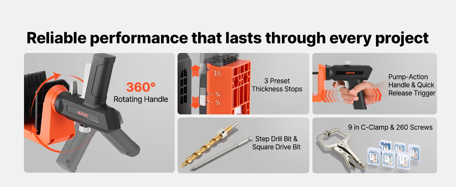• Snel en veilig klemmen: Dit pocket hole boorsysteem is voorzien van een geïntegreerde pompklem voor snelle bevestiging in hout. De 360° draaibare handgreep zorgt voor een comfortabele grip vanuit verschillende hoeken – draaien of extra gereedschap is niet nodig.