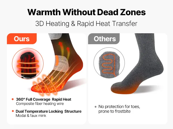 360° verwarming: De verwarmingsdraad in onze elektrisch verwarmde sokken omhult je tenen, voetzolen en toppen en zorgt voor een gelijkmatige warmte, zodat je zelfs bij koud weer comfortabel warm blijft. Ideaal voor buitenwerkers en wintersporters – warmte waar je die het meest nodig hebt.