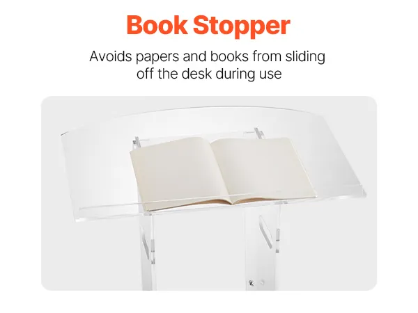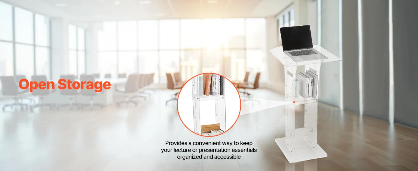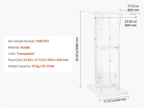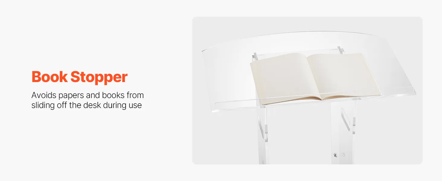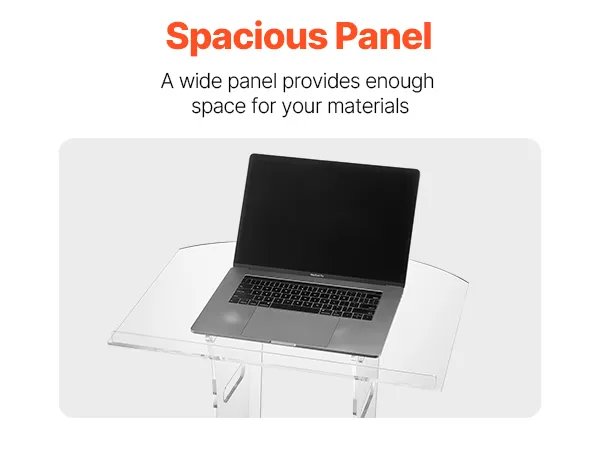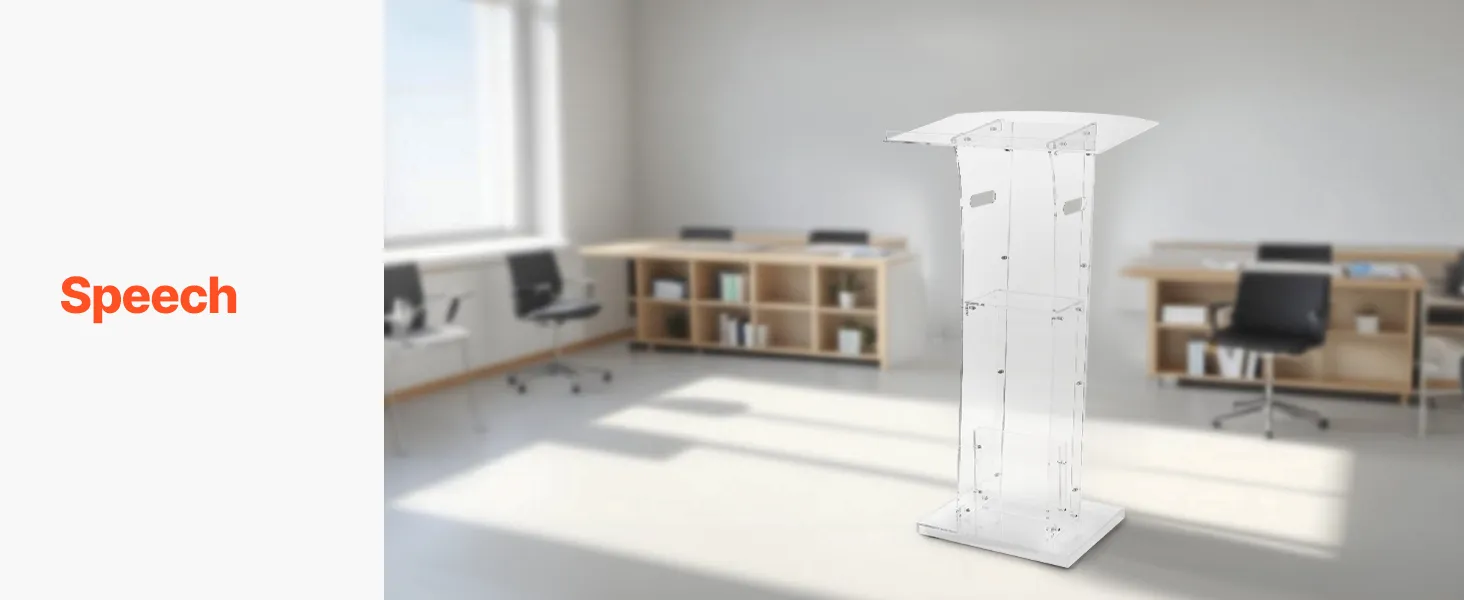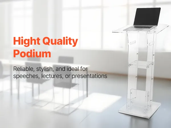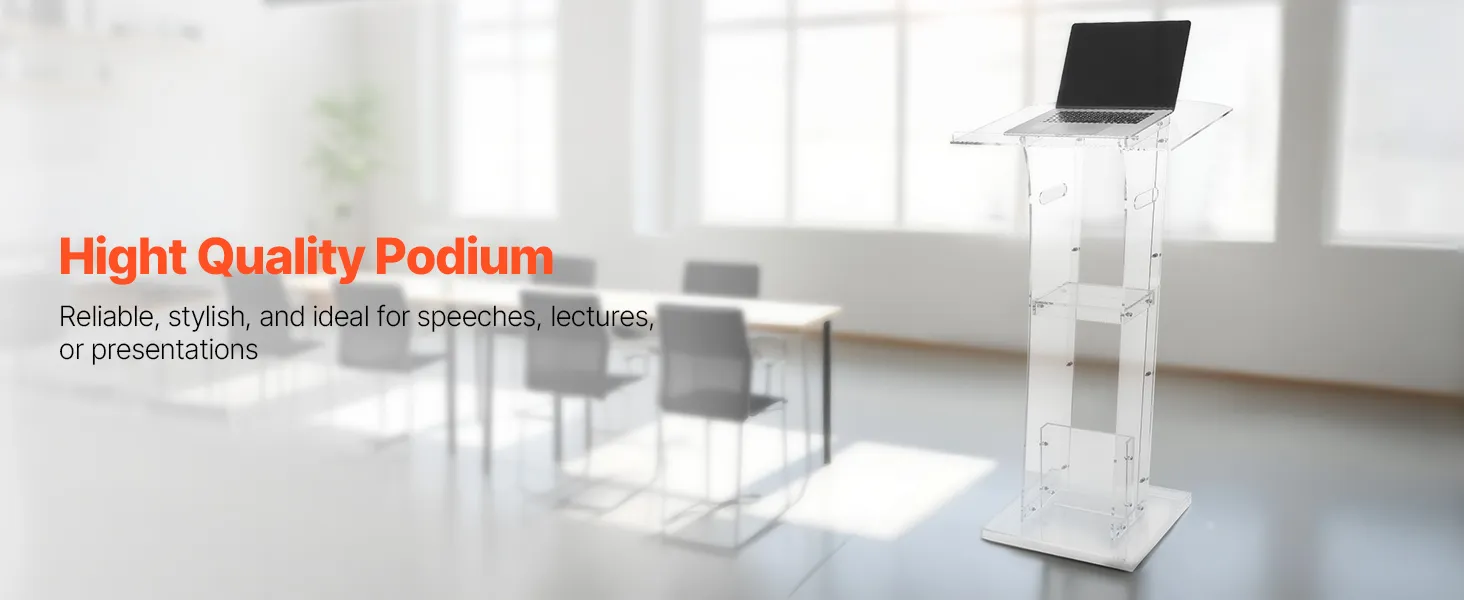 Stevige acrylconstructie: dit spreekgestoelte is gemaakt van duurzaam acryl en is bestand tegen veelvuldig gebruik. Een versterkte metalen voet zorgt voor stabiliteit en ondersteuning, waardoor sprekers een betrouwbaar platform hebben voor boeiende presentaties.