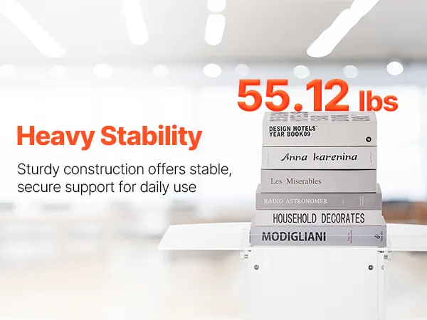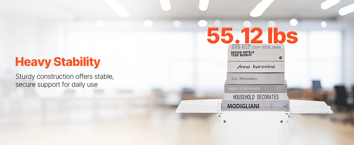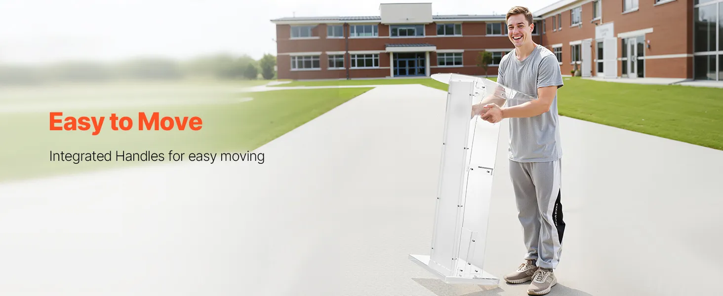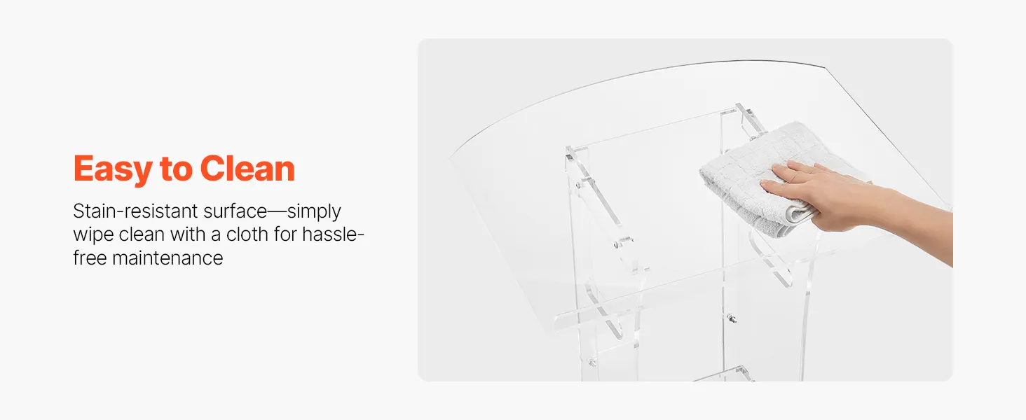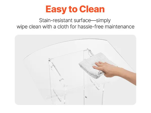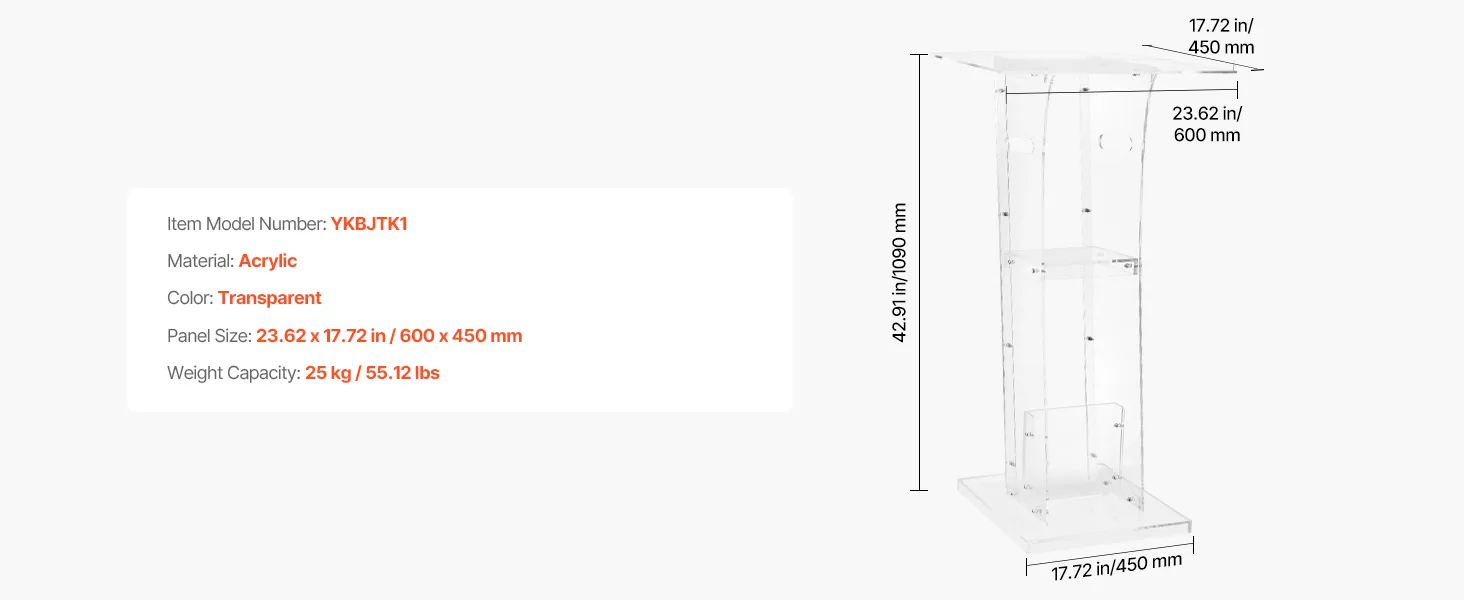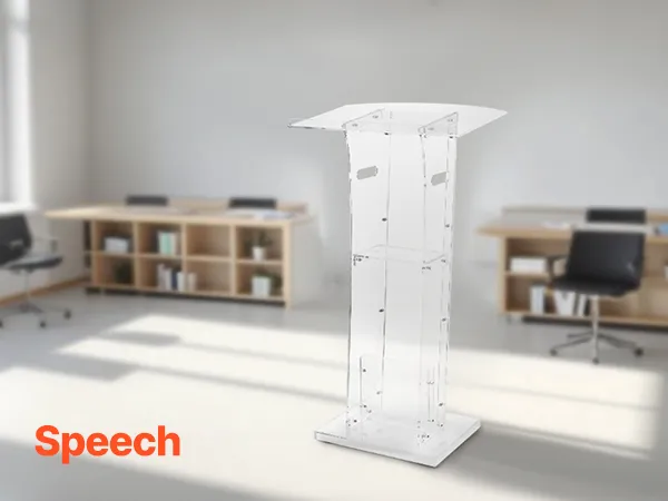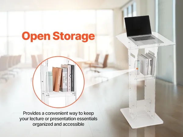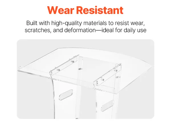 Stevige acrylconstructie: dit spreekgestoelte is gemaakt van duurzaam acryl en is bestand tegen veelvuldig gebruik. Een versterkte metalen voet zorgt voor stabiliteit en ondersteuning, waardoor sprekers een betrouwbaar platform hebben voor boeiende presentaties.