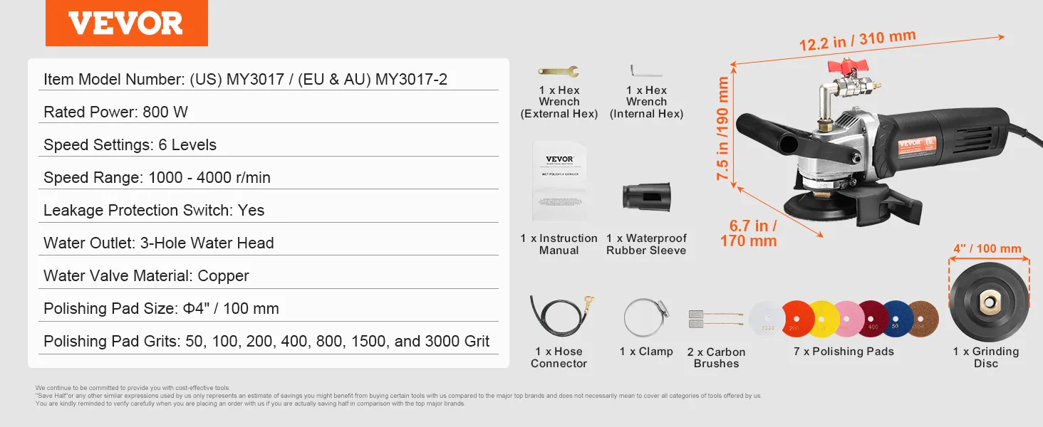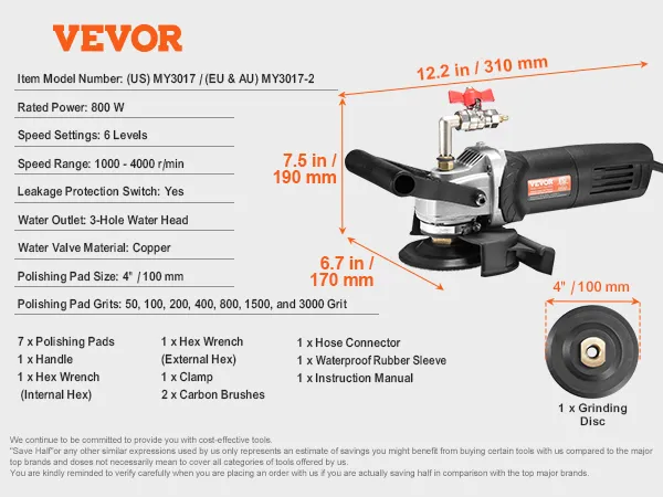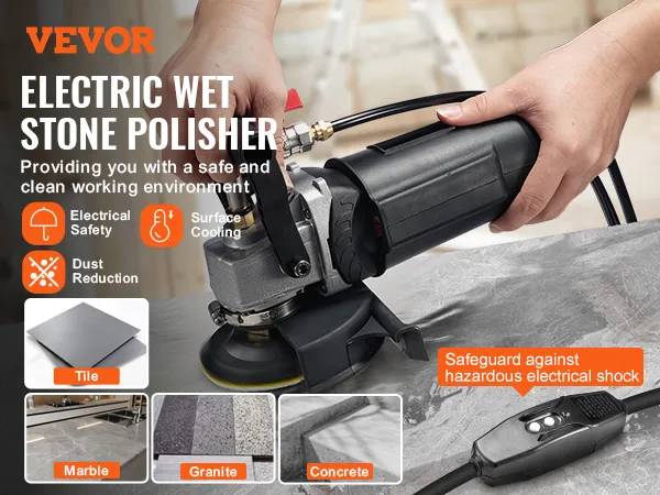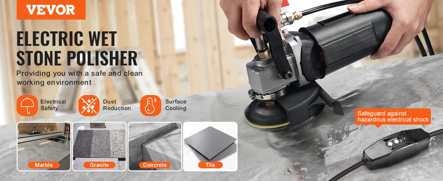 Safety First in Every Use: Prioritize safety with the VEVOR wet polisher's GFCI switch that protects against electrical shocks, a splash guard that blocks water and dust, and a waterproof rubber sleeve to safeguard the motor. This stone polisher is designed for safe and reliable performance.