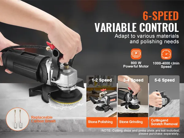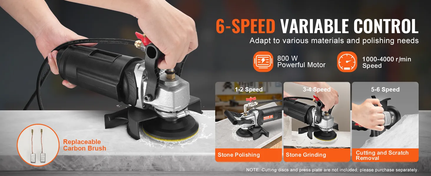 6 Variable Speeds for Versatile Polishing: Achieve a flawless finish with the VEVOR rock polisher, featuring 6 variable speeds ranging from 1000 to 4000 RPM. Effortlessly tackle different materials like marble, granite, concrete, and tiles with this wet grinder's adjustable speed settings, ensuring precision and efficiency.