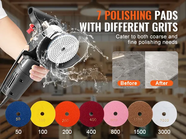 Our wet polisher is equipped with 7 polishing pads ( 50, 100, 200, 400, 800, 1500, 3000 Grit), making it versatile for various tasks. Whether you're tackling heavy rust removal or refining smooth surfaces, these pads ensure you achieve a top-quality finish.