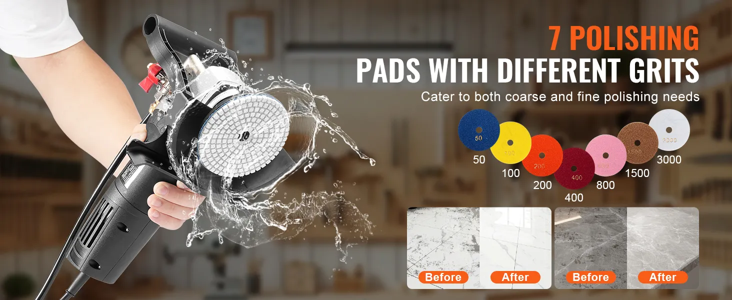 Inclusive Pad Range for All Applications: Our marble polishing kit comes with 7 polishing pads of varying grits from 50 to 3000, perfect for coarse grinding or fine polishing. These pads effectively remove rust, oxide layers, and scratches, making the concrete grinder versatile for multiple surfaces.