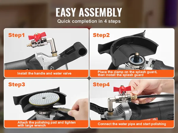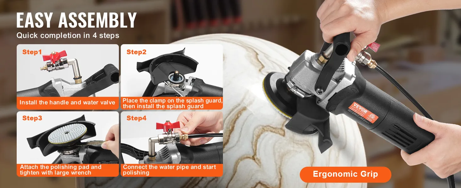 Assemble our wet polisher effortlessly in 4 simple steps. With its lightweight design, enhanced heat dissipation, and ergonomic D-shaped soft grip, it reduces user fatigue and provides lasting comfort during extended use.