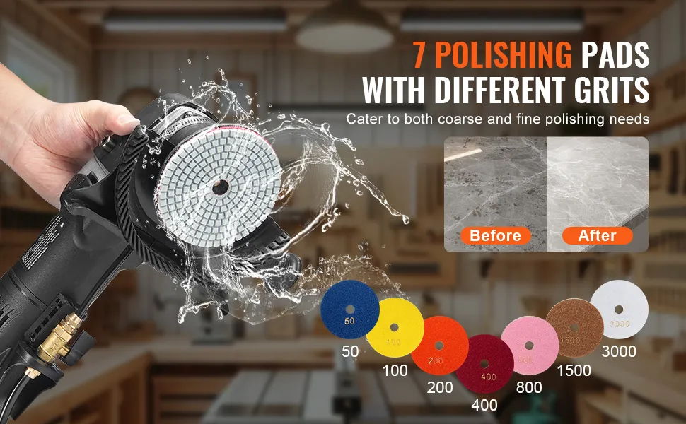 Complete polijstsets: Deze natte betonpolijstmachine wordt geleverd met 7 multifunctionele polijstpads met korrelgrootte 50 tot 3000. Van grondige roestverwijdering tot fijn polijsten, deze granietpolijstset biedt alles wat je nodig hebt voor een professionele afwerking.