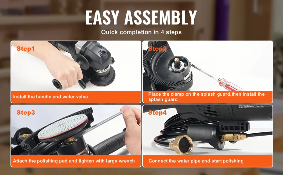 Monteer onze natte polijstmachine eenvoudig in 4 eenvoudige stappen. Dankzij het lichtgewicht ontwerp, de verbeterde warmteafvoer en de ergonomische, zachte grip met twee handen, vermindert de machine vermoeidheid en biedt hij langdurig comfort tijdens langdurig gebruik.