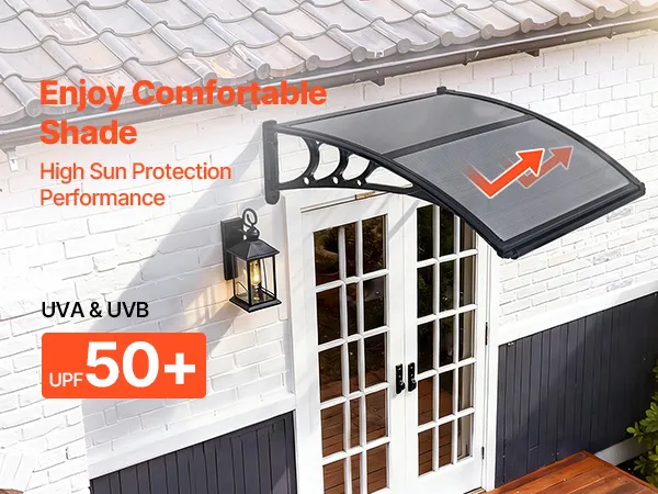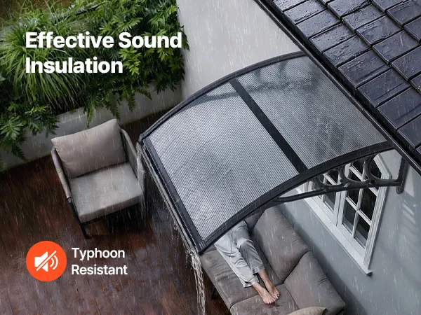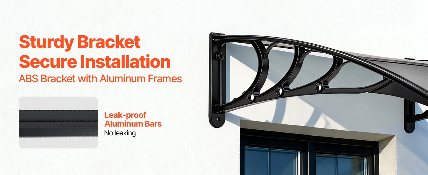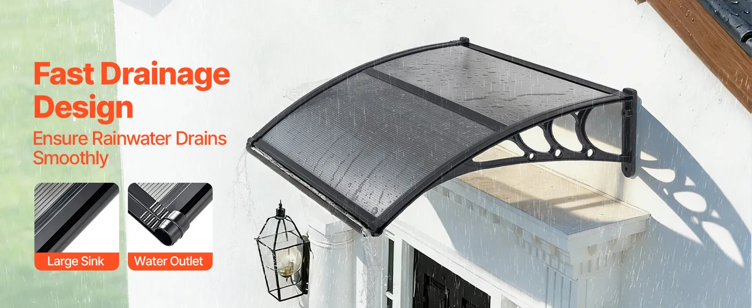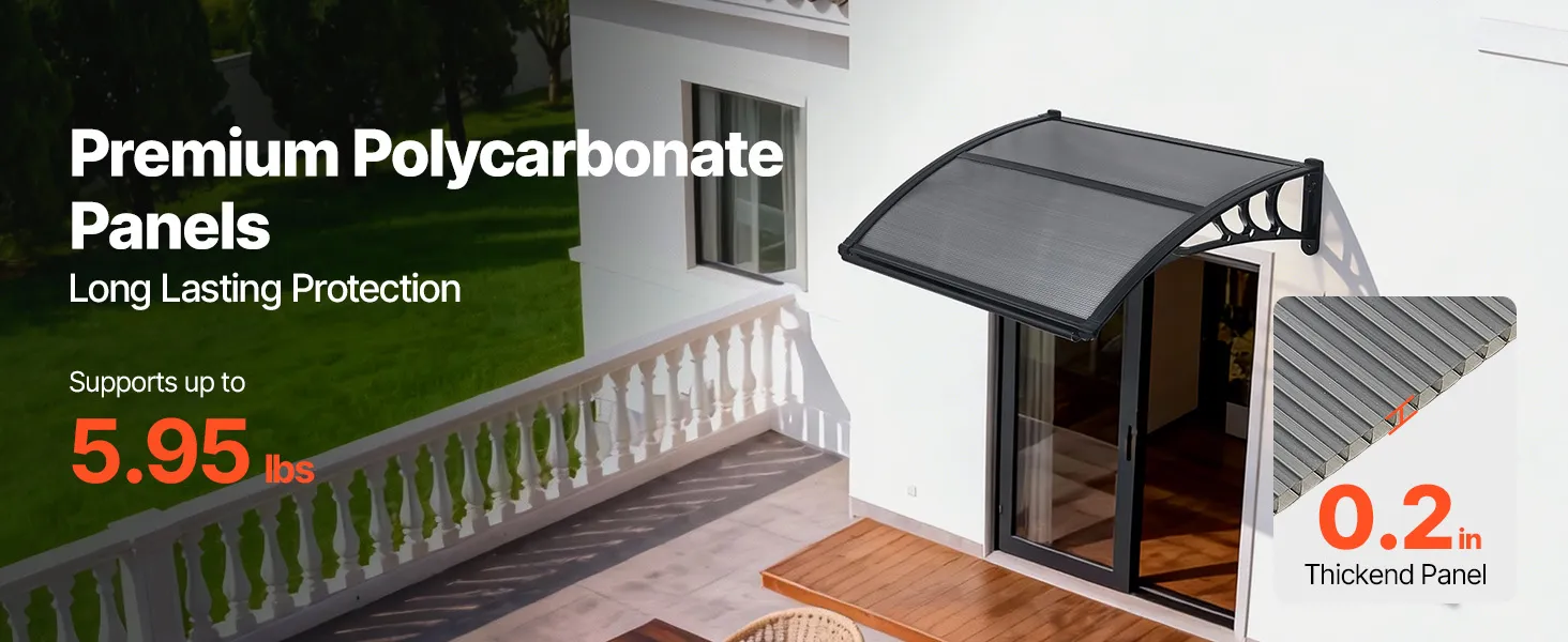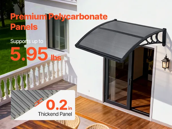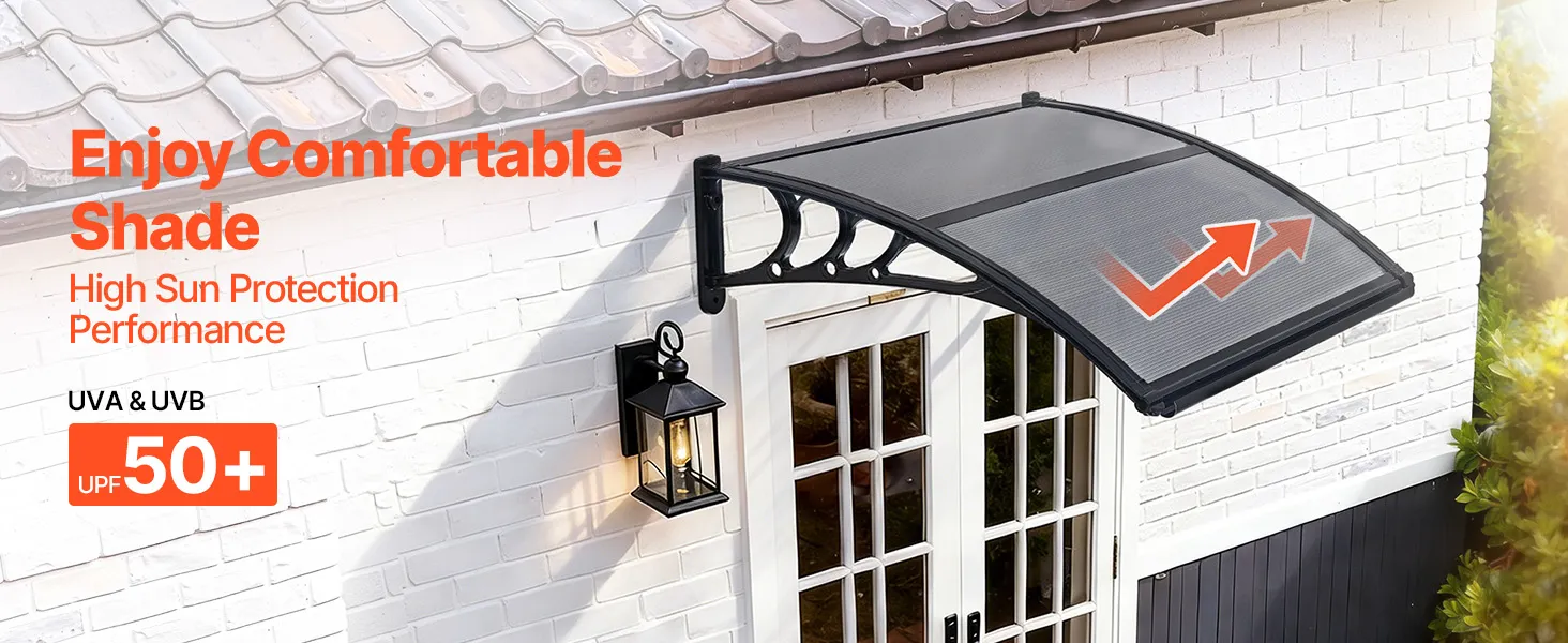 Robuuste en duurzame constructie: Deze deurafdak, gemaakt van zeer transparante polycarbonaatpanelen en versterkte ABS-beugels, biedt een uitstekend draagvermogen. Het is slagvast, brandvertragend, geluidsabsorberend en geeft uw huis een moderne, elegante uitstraling.