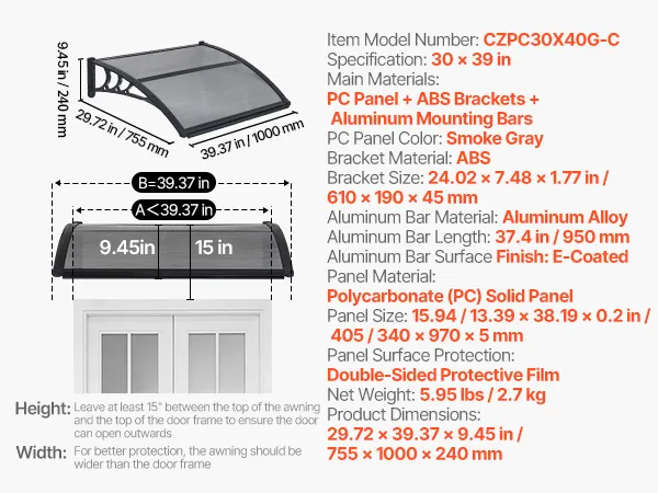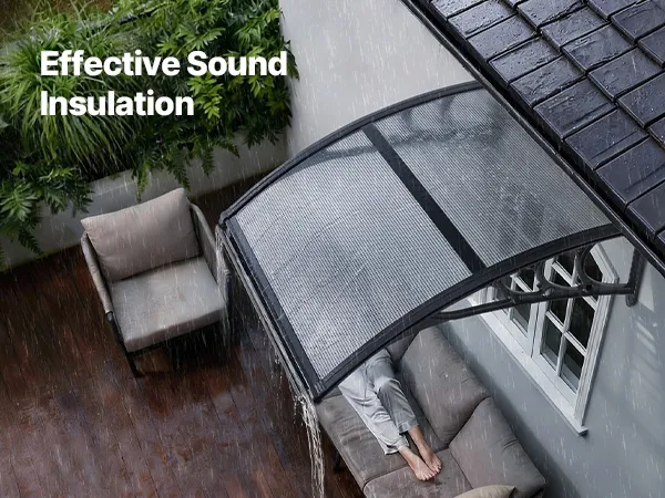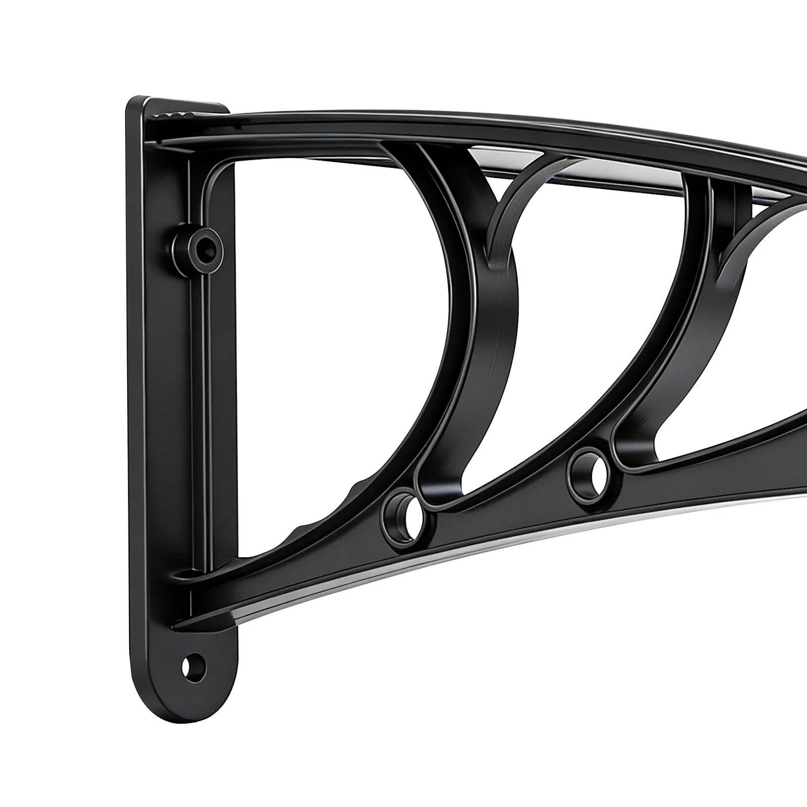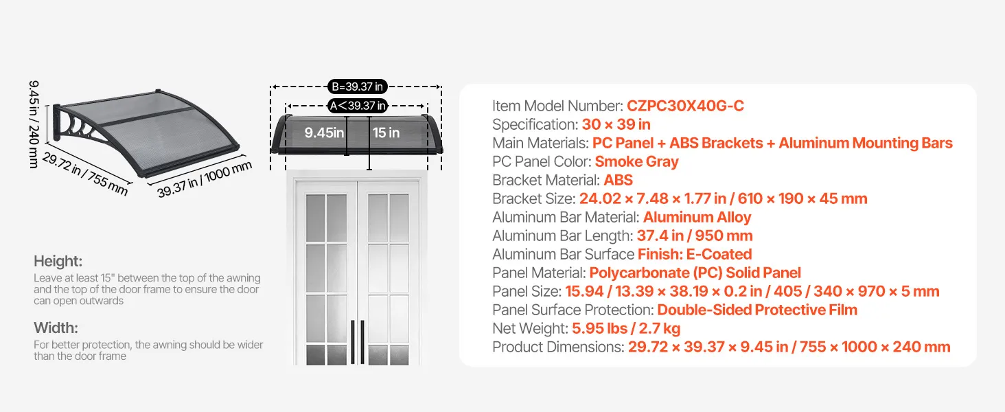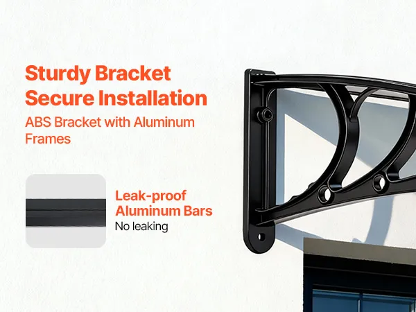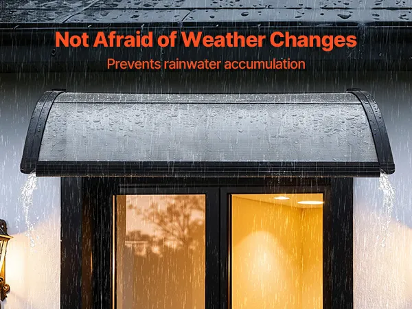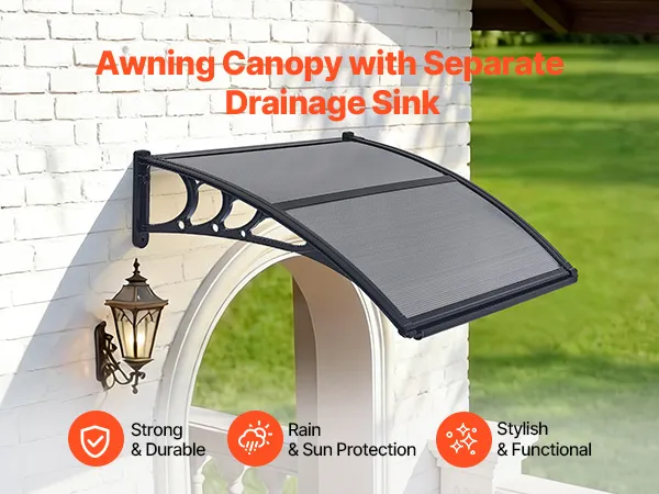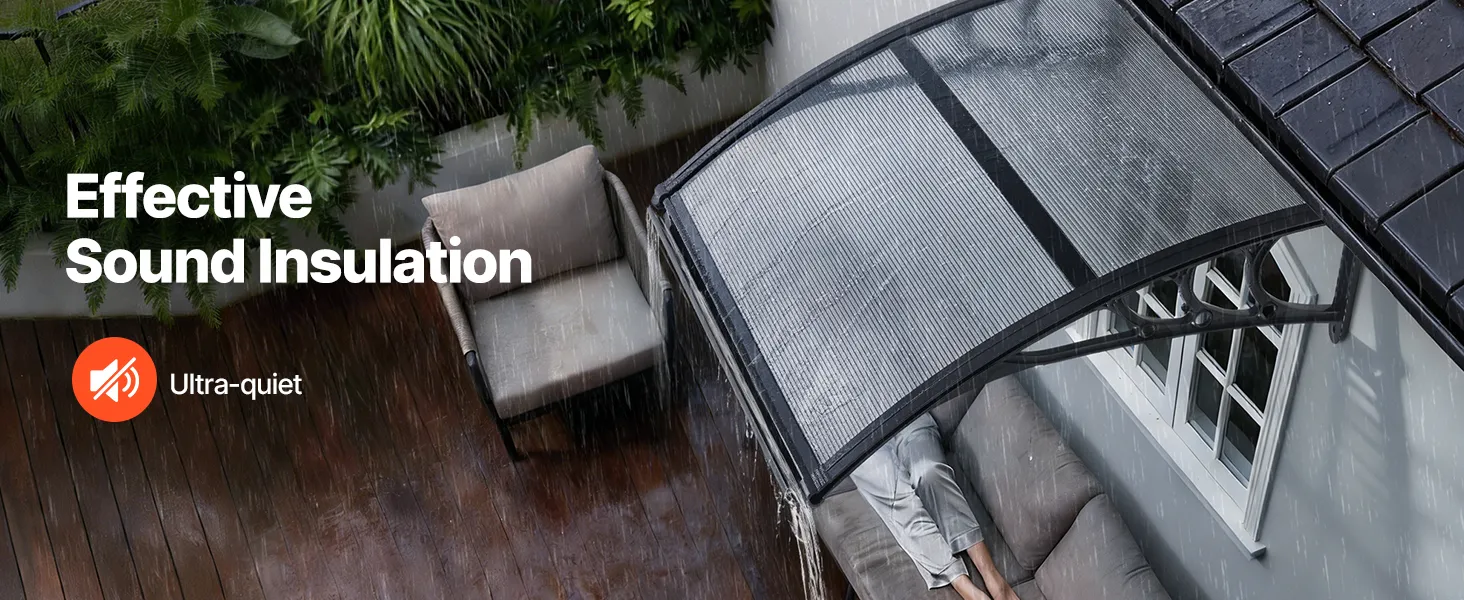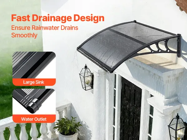 Robuuste en duurzame constructie: Deze deurafdak, gemaakt van zeer transparante polycarbonaatpanelen en versterkte ABS-beugels, biedt een uitstekend draagvermogen. Het is slagvast, brandvertragend, geluidsabsorberend en geeft uw huis een moderne, elegante uitstraling.