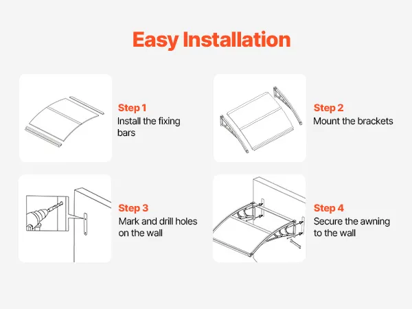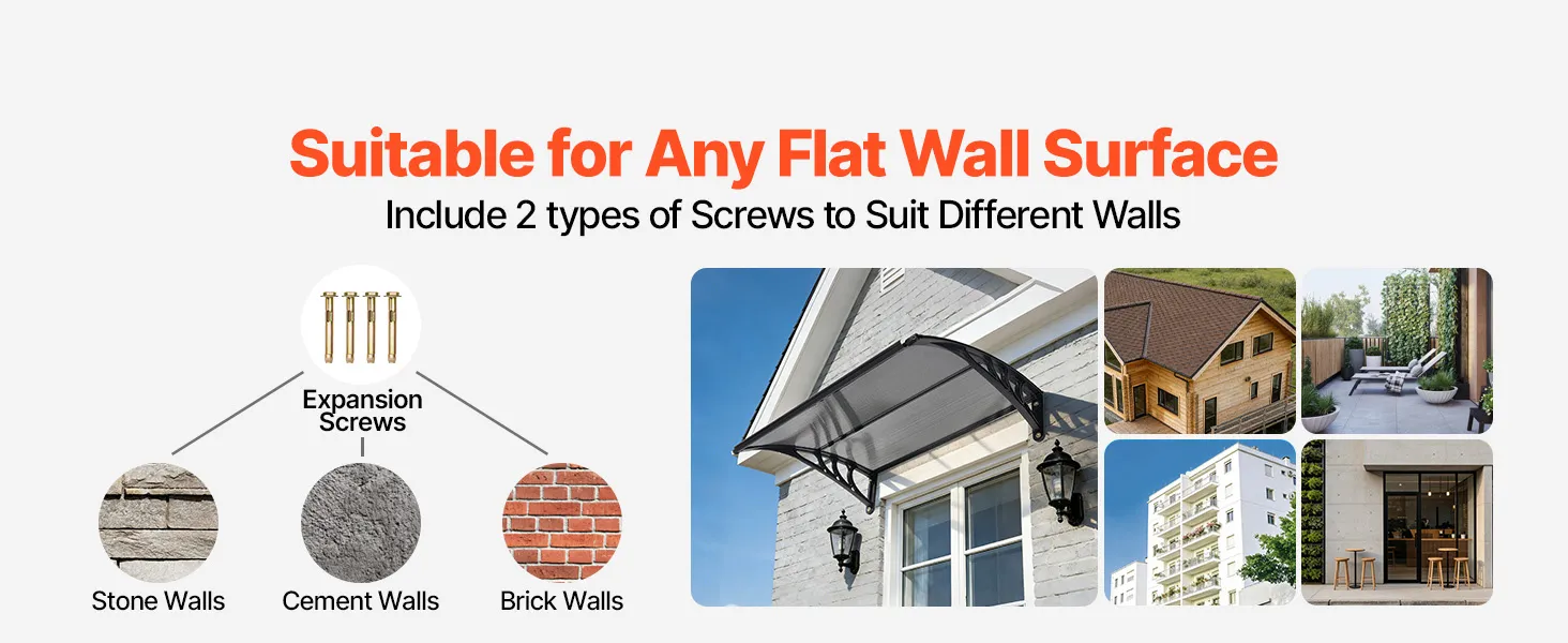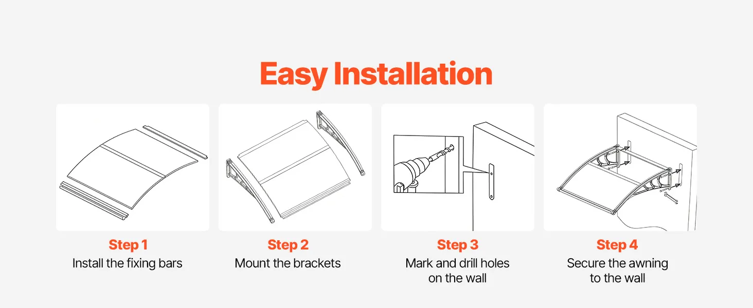 Snelle zelfmontage: Deze afdakluifel voor buiten wordt geleverd met een complete accessoirekit, een duidelijke montagehandleiding en twee soorten bevestigingsschroeven voor bakstenen, betonnen of houten muren. Eenvoudige montage door één persoon. Meet de beschikbare ruimte op voor de optimale pasvorm.