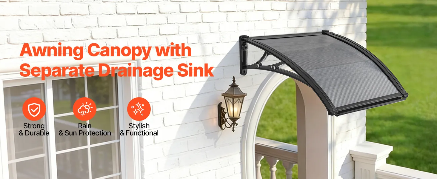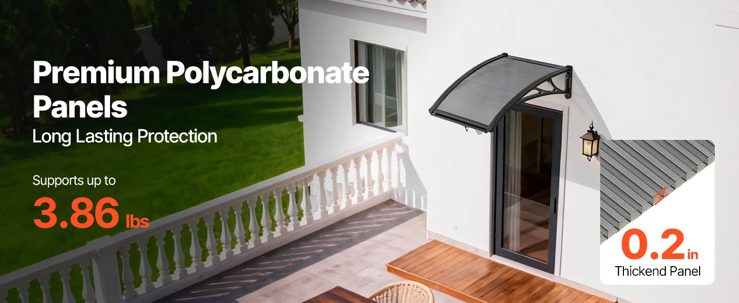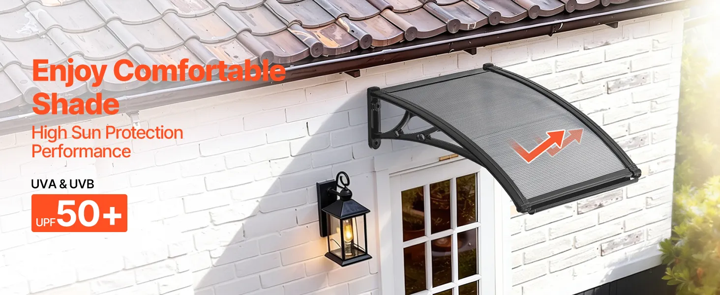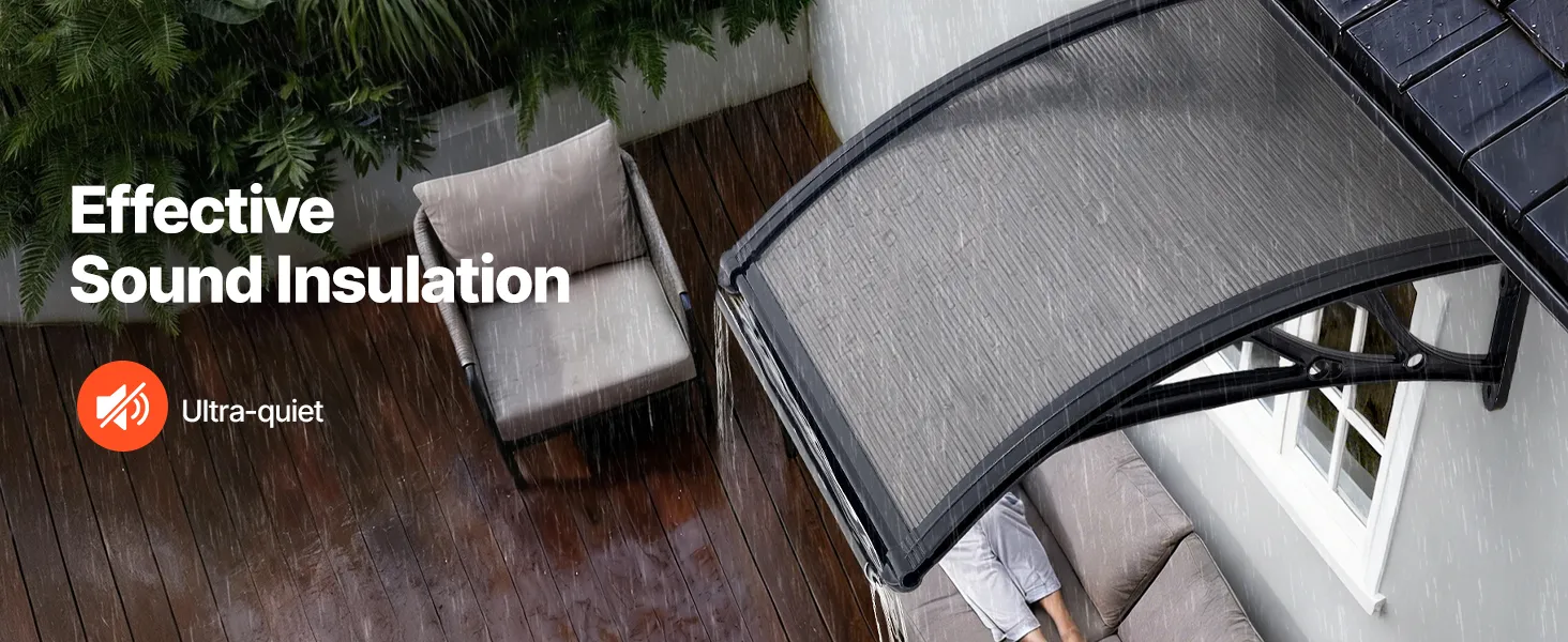 Robuuste en duurzame constructie: Deze luifel, gemaakt van zeer transparante polycarbonaatpanelen en versterkte ABS-beugels, biedt een uitstekend draagvermogen. Hij is slagvast, brandvertragend, geluidsabsorberend en geeft uw huis een moderne, elegante uitstraling.