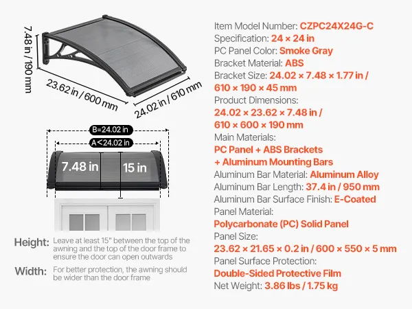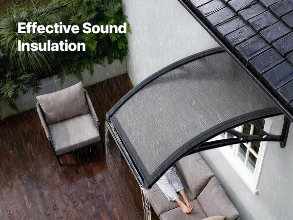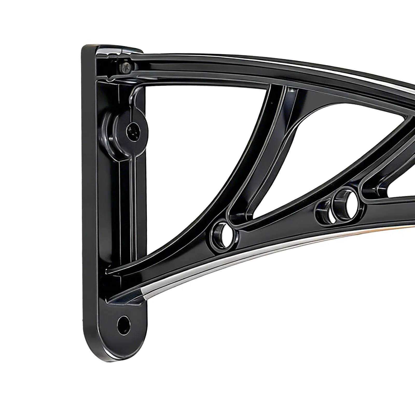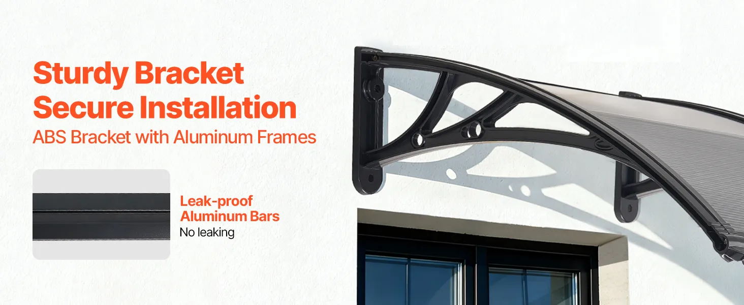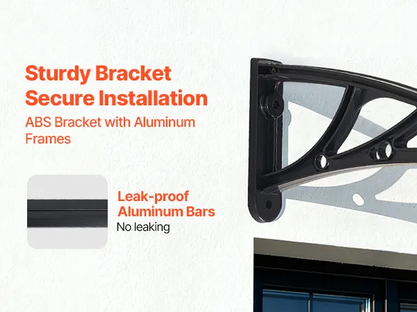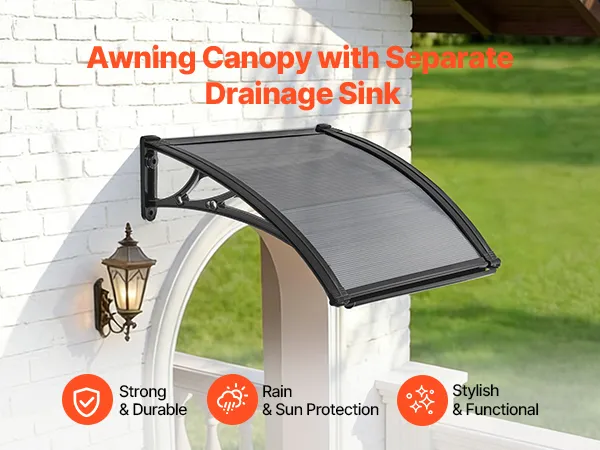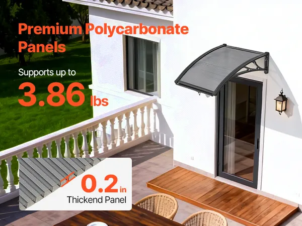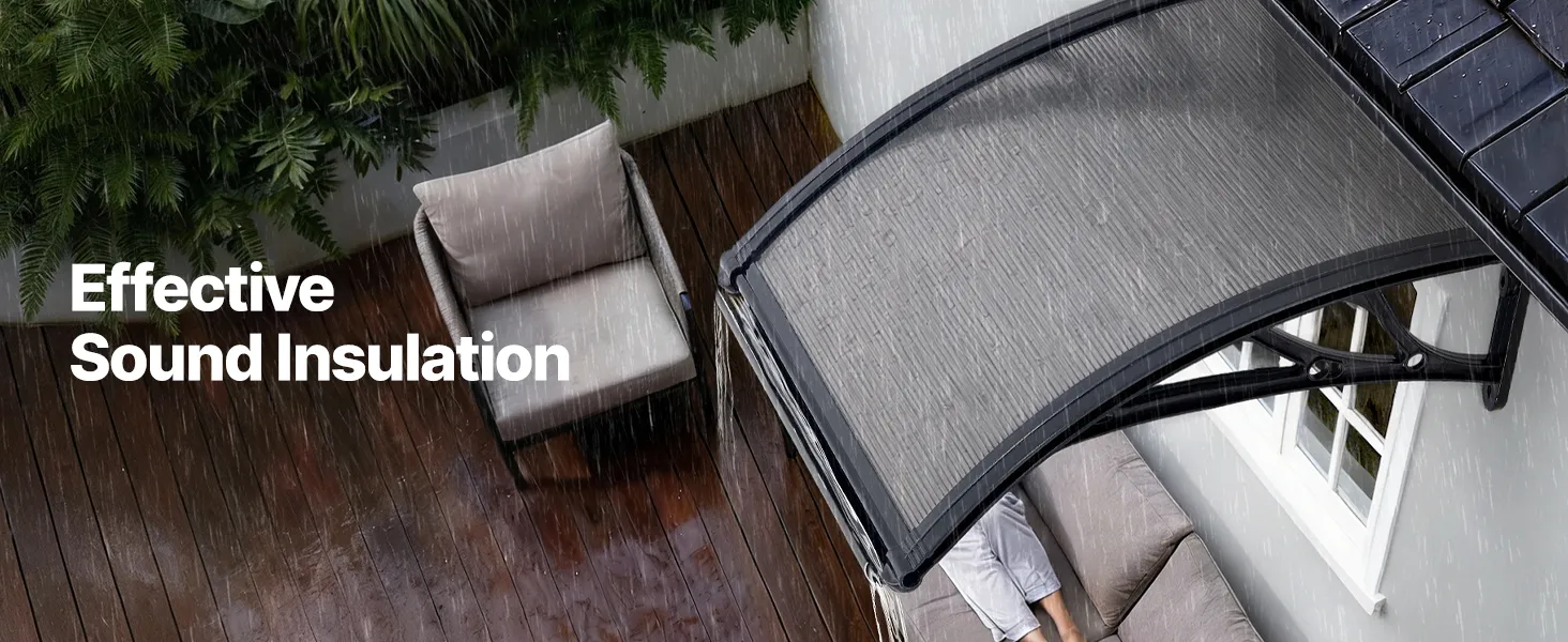Robuuste en duurzame constructie: Deze luifel, gemaakt van zeer transparante polycarbonaatpanelen en versterkte ABS-beugels, biedt een uitstekend draagvermogen. Hij is slagvast, brandvertragend, geluidsabsorberend en geeft uw huis een moderne, elegante uitstraling.