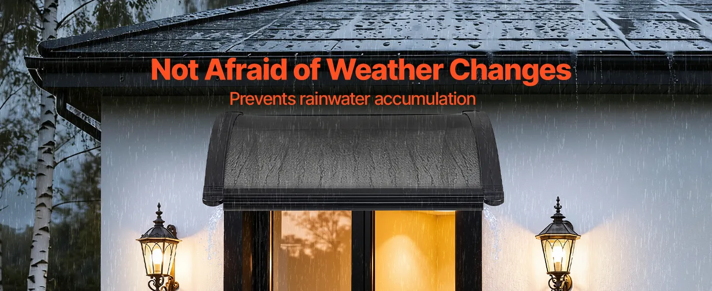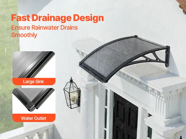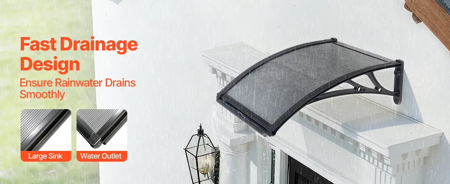 Efficiënt afwateringssysteem: Dankzij een geoptimaliseerd, gericht afwateringssysteem voert deze polycarbonaat voordeurluifel regenwater snel en effectief van uw ingang af. Of het nu licht regent of hard regent, uw entree blijft schoon, droog en antislip.