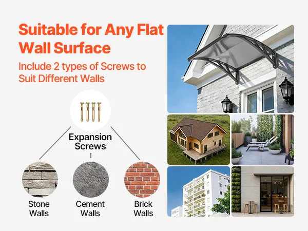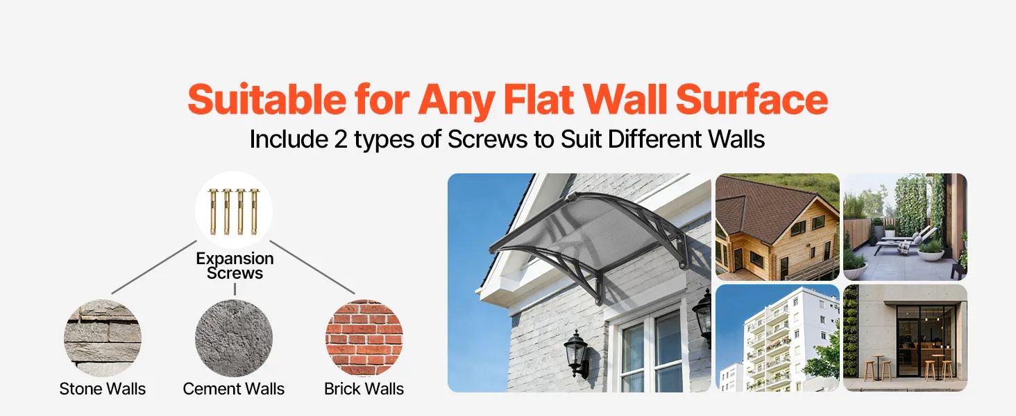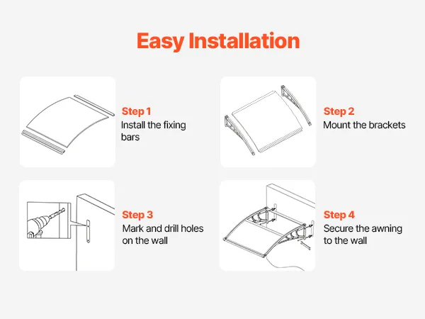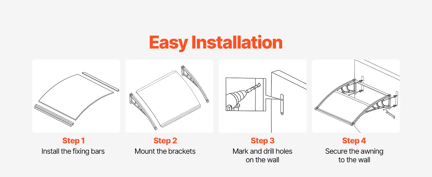 Snelle zelfmontage: Deze afdakluifel voor buiten wordt geleverd met een complete accessoirekit, een duidelijke montagehandleiding en twee soorten bevestigingsschroeven voor bakstenen, betonnen of houten muren. Eenvoudige montage door één persoon. Meet de beschikbare ruimte op voor de optimale pasvorm.