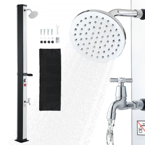 VEVOR Solardouche 35 L, Tuindouche 2160 mm, Buitendouche met voetkraan en zeepbakje, Warm- en koudwaterregeling, max. 60 °C, Campingdouche voor tuin, zwembad, strandzwembad, Zwart/Zilver