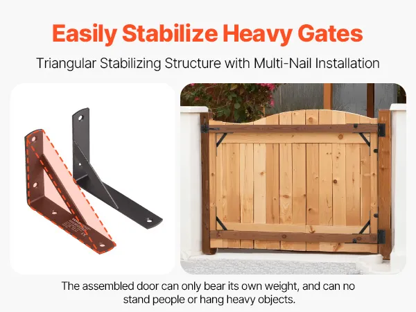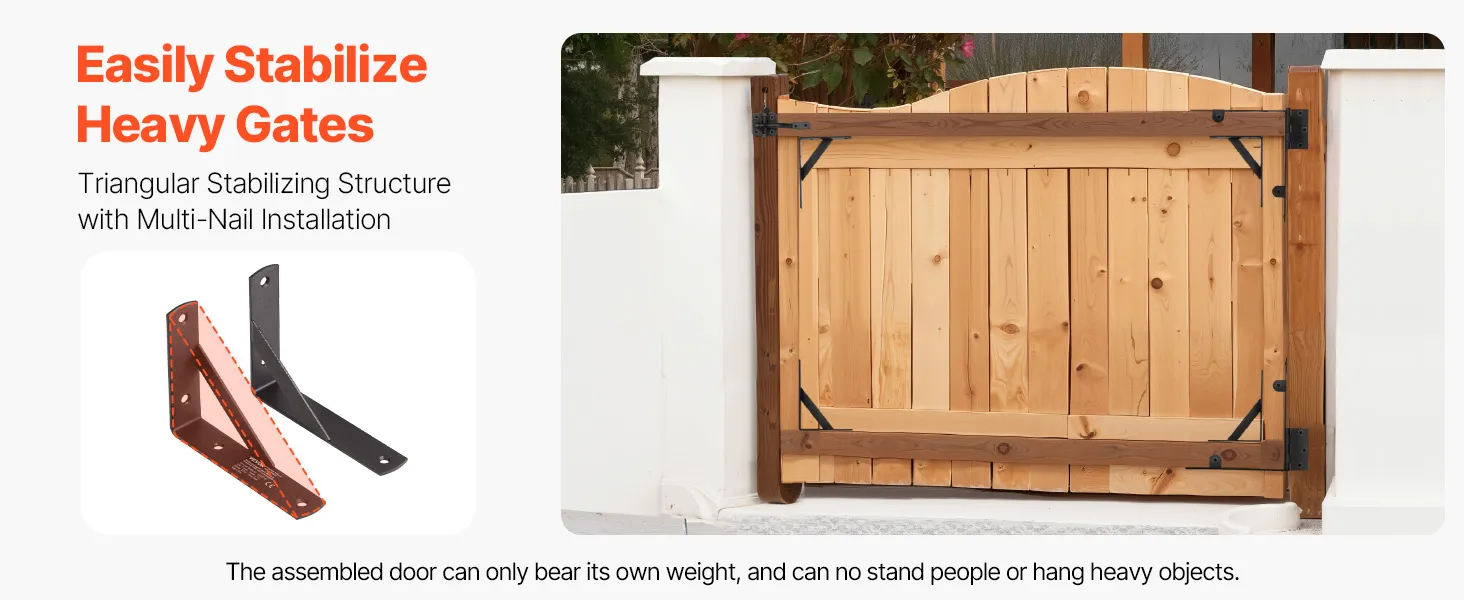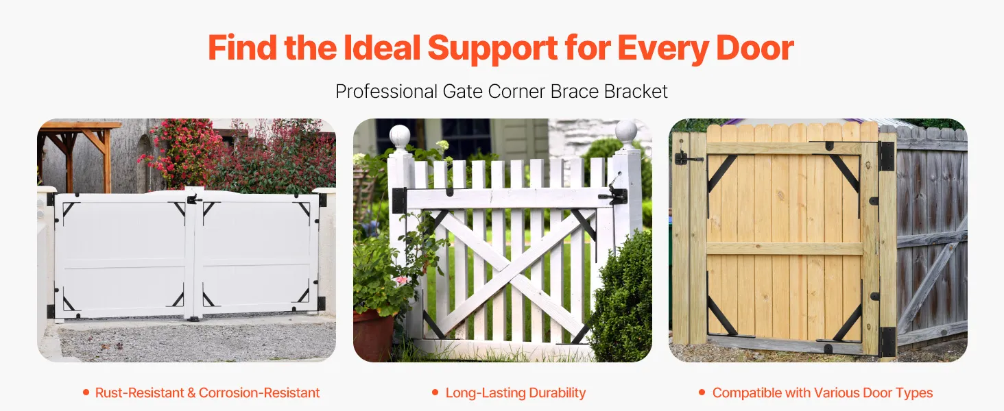 This metal iron gate corner brace bracket avoids sagging and aging, compatible with 99% of door types on the market. It's rust and corrosion-resistant, weatherproof against heavy rain, snow, and extreme conditions, ensuring long-lasting outdoor use for doors of all types and sizes.