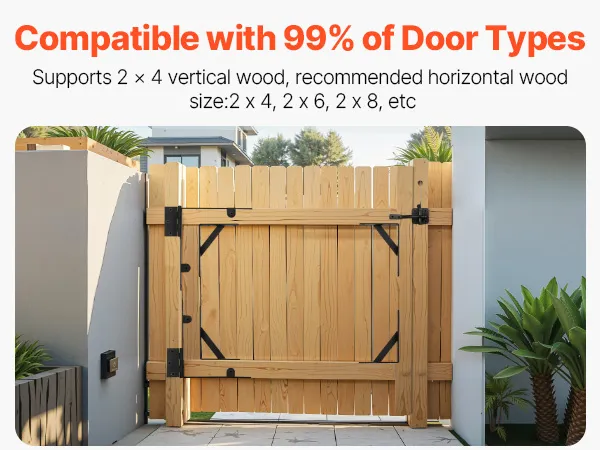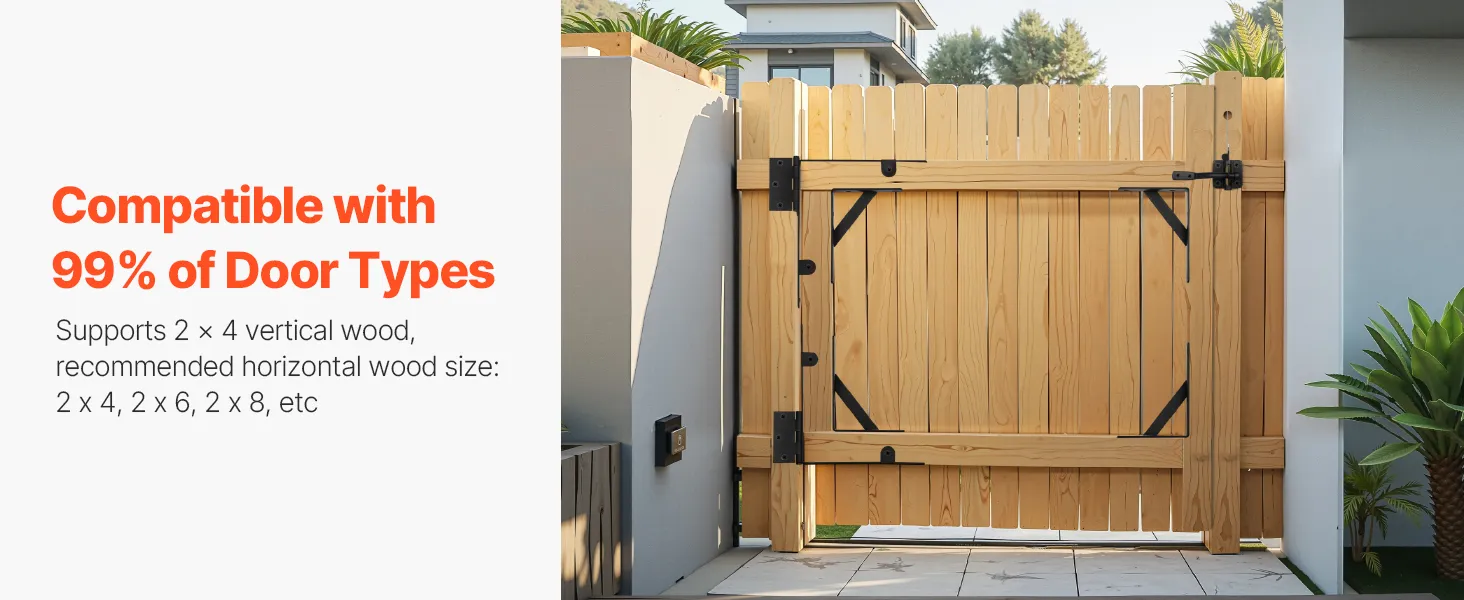 Compatible with 99% of door types, including shed doors, driveway gates, livestock gates, wooden windows, deck doors, pool gates, barn doors, and more. This gate frame hardware kit fits 2 x 4 in and larger wood sizes, providing a versatile solution for various door installations.