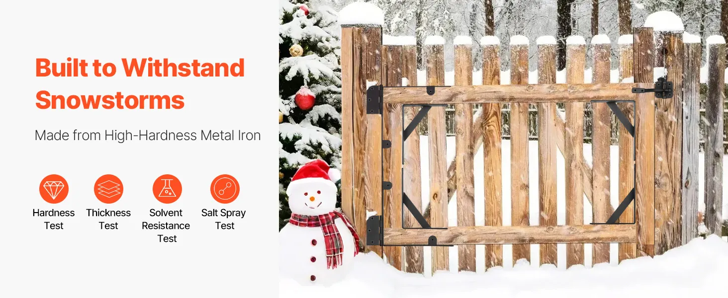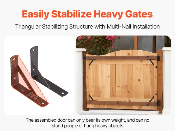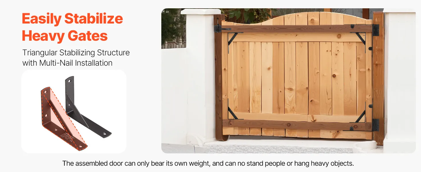This metal iron gate corner brace bracket avoids sagging and aging, compatible with 99% of door types on the market. It's rust and corrosion-resistant, weatherproof against heavy rain, snow, and extreme conditions, ensuring long-lasting outdoor use for doors of all types and sizes.