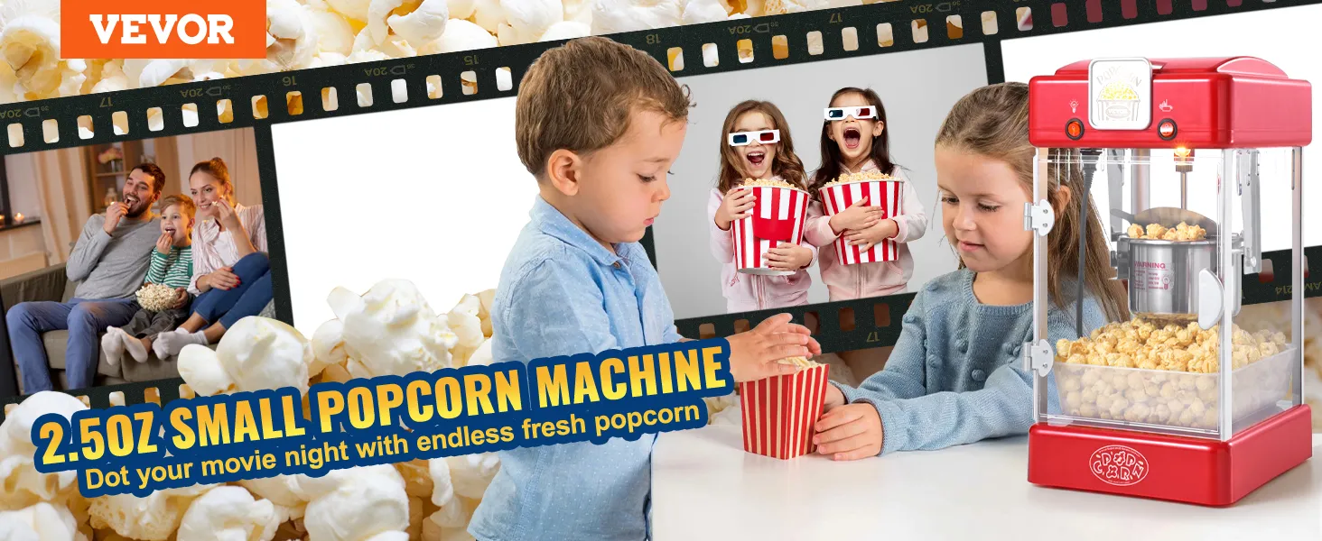 VEVOR Popcornmachine, 300W Popcornmachine, 2,5 oz Ketel Maakt 4 liter per batch, Tafelmodel Popcornmachine met PP-deur, Inclusief 2 scheppen en schaal, Bioscoopstijl, Rood
