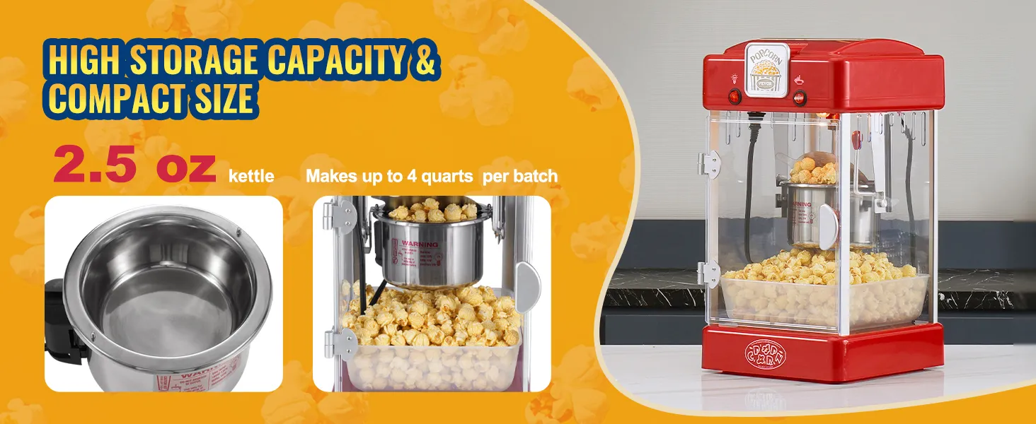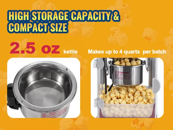 Grote kracht voor kleine machines: deze commerciële popcornmachine heeft een capaciteit van 2,5 oz en kan 4 liter popcorn per vulling maken. De ketel is binnen enkele minuten opgewarmd en is klaar om sportfans, festivalgangers en feestgangers te voorzien van voldoende popcorn.
