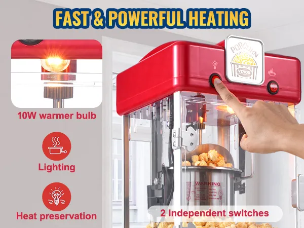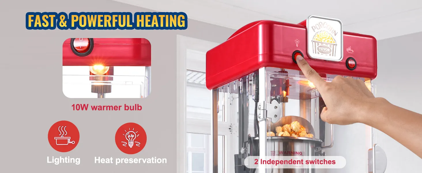Dankzij de onafhankelijke dubbele schakelaar kan de popcornmachine beginnen met koken. De afgewerkte popcorn valt op de warmhoudplaat en blijft vers totdat je hem wilt serveren. Het warme 10W-lampje verlicht de popcorn.