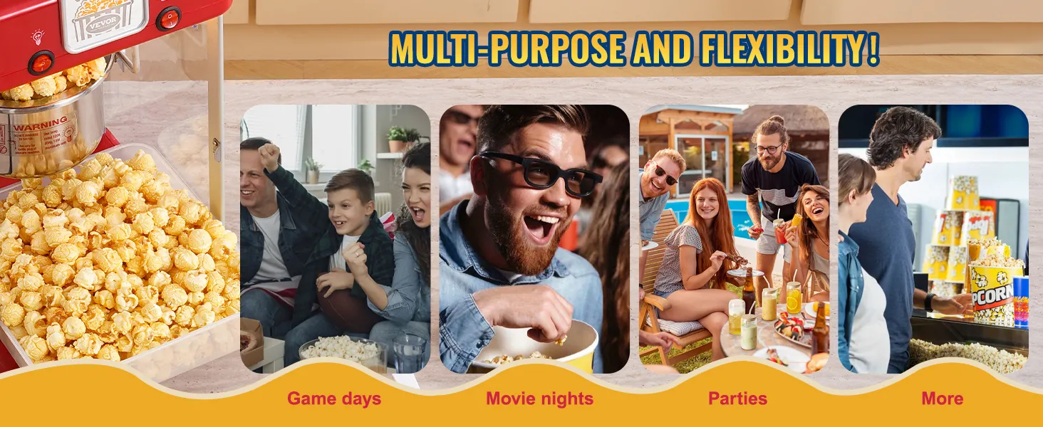 Deze popcornmachine is geschikt voor tal van evenementen zoals verjaardagsfeestjes, bijeenkomsten, liefdadigheidsevenementen en sportevenementen.