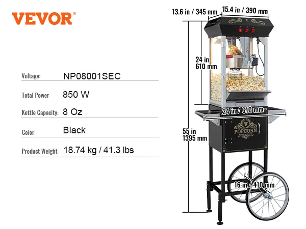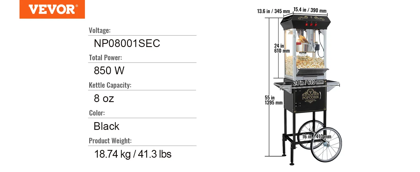 VEVOR Popcornmachine met kar, 850W popcornmaker, 8 oz waterkoker voor 48 kopjes per lading, popcornmachine met gehard glas inclusief 4 scheppen, bioscoopstijl restaurant, zwart