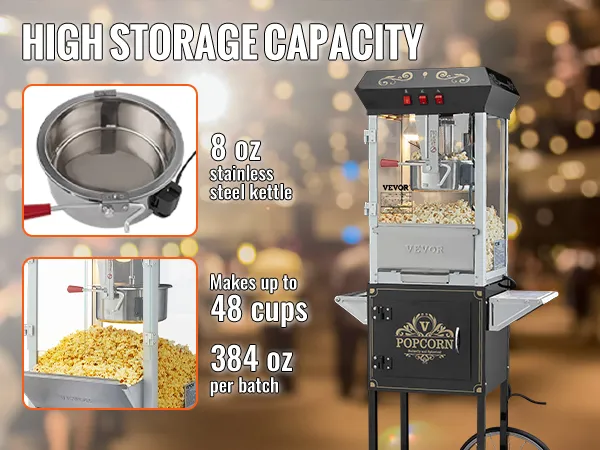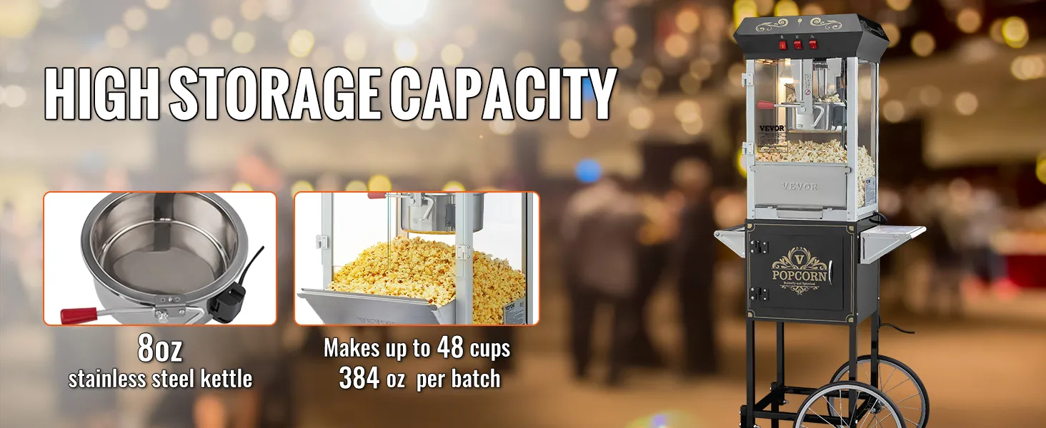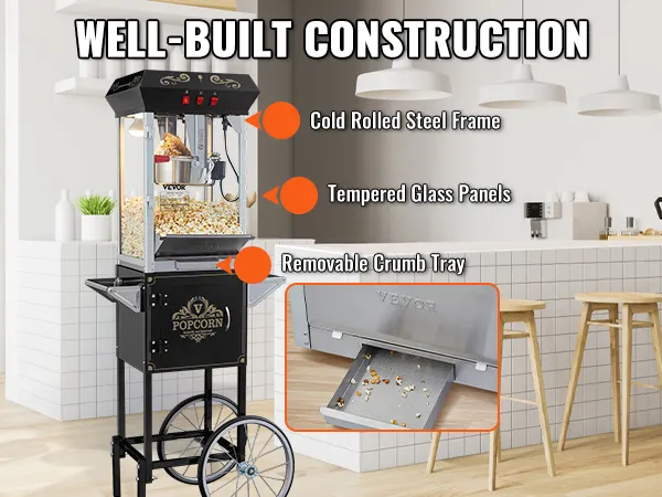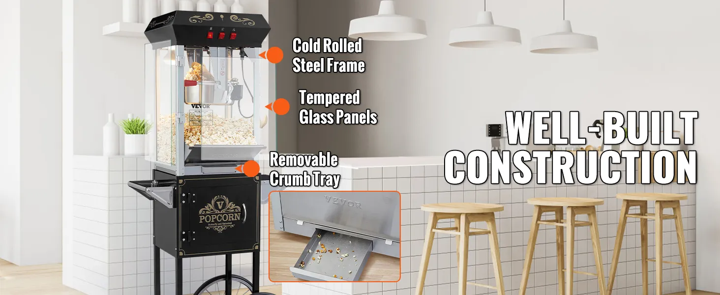 Gebruiksvriendelijk ontwerp: Zodra de hete kom begint te vullen, open je eenvoudig de klep eronder en de popcorn is er en kan worden verwijderd! De uitneembare kruimellade houdt de binnenkant schoon en voorkomt dat korrels rondstrooien. Het verzamelen en afvoeren van gevallen graan was nog nooit zo eenvoudig! Hij heeft een ingebouwde kast en zijplanken en biedt voldoende ruimte voor al het benodigde gereedschap.