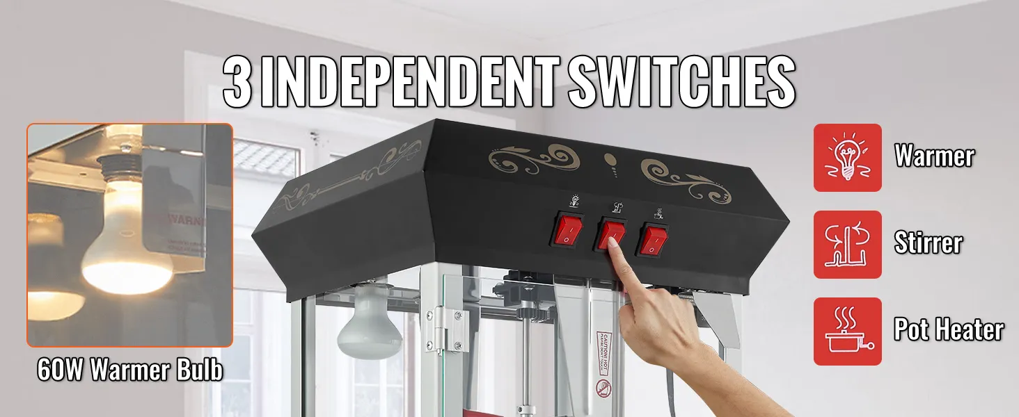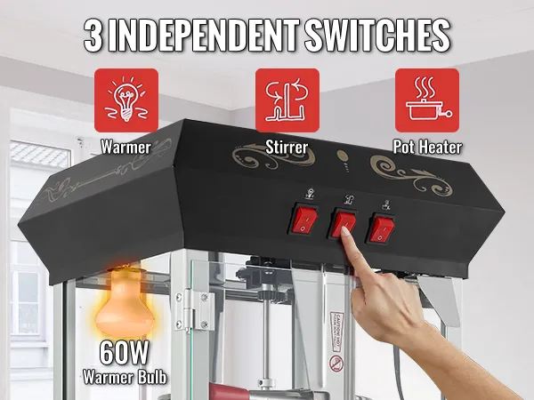 Eenvoudig in gebruik en langdurige warmte: Drie duidelijke schakelaars bedienen de hele popcornmachine: verwarmingselement, roerwerk en boilerverwarmer. Dit vereenvoudigt de bediening en maakt het voor iedere medewerker gemakkelijk te hanteren. De warmhoudplaat eronder is voorzien van een 50W verwarmingselement en een 60W warmhoudlampje dat de popcorn helder verlicht.