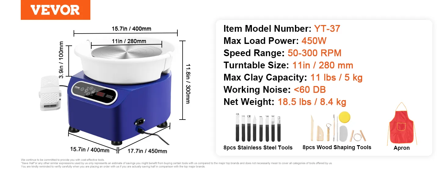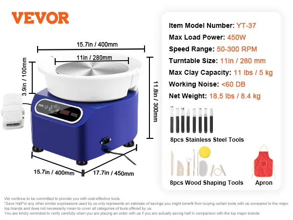 Professionele 17-delige gereedschapsset: onze draaitafel wordt geleverd met een 17-delige gereedschapsset, die 8 roestvrijstalen gereedschappen, 8 houten gereedschappen en een waterdicht schort bevat. Of u nu een studioprofessional, een klasleraar of een doe-het-zelver bent, deze machine is de ideale keuze.