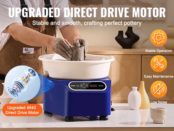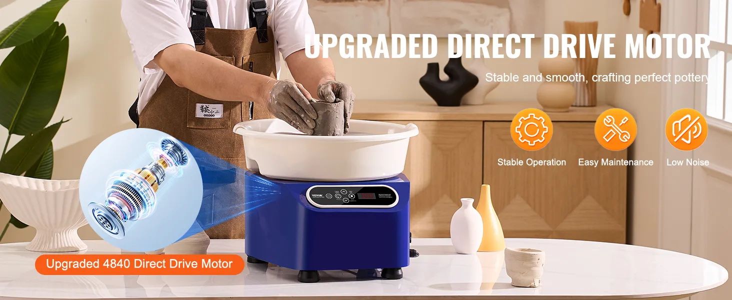 Hoge stabiliteit: onze pottenbakkersschijf is uitgerust met een moderne motor met directe aandrijving. Het biedt perfecte stabiliteit bij zowel lage als hoge snelheden, vermindert onregelmatige vormen of vervorming tijdens het draaiproces en helpt u stukken van hoge kwaliteit te produceren.