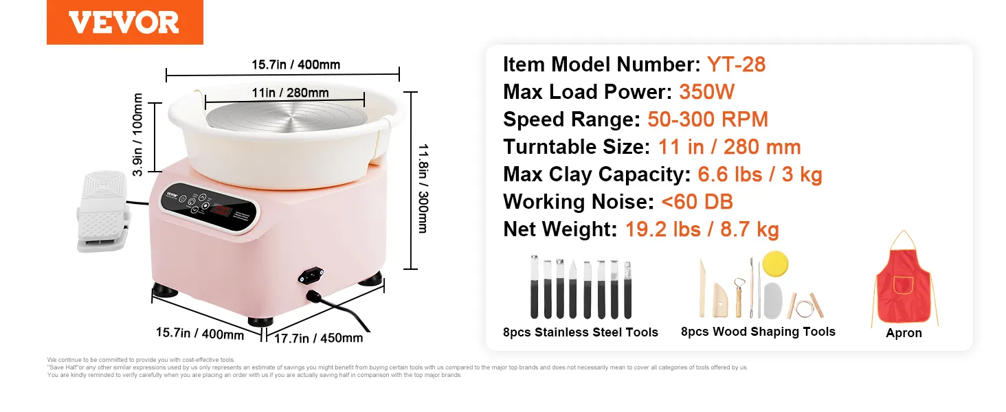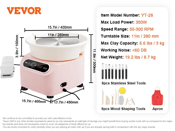 Professionele 17-delige gereedschapsset: onze draaitafel wordt geleverd met een 17-delige gereedschapsset, die 8 roestvrijstalen gereedschappen, 8 houten gereedschappen en een waterdicht schort bevat. Of u nu een studioprofessional, een klasleraar of een doe-het-zelver bent, deze machine is de ideale keuze.