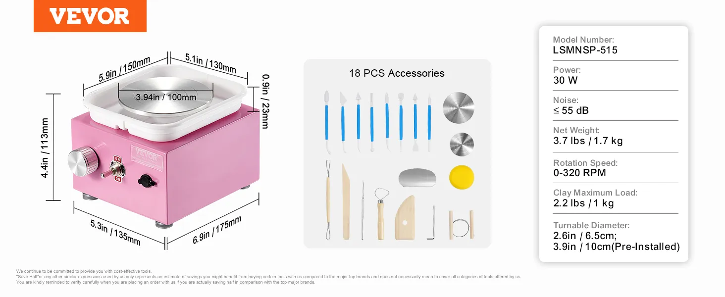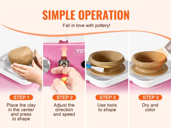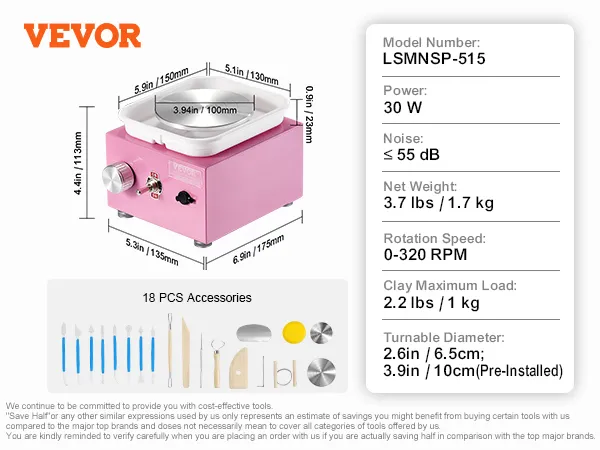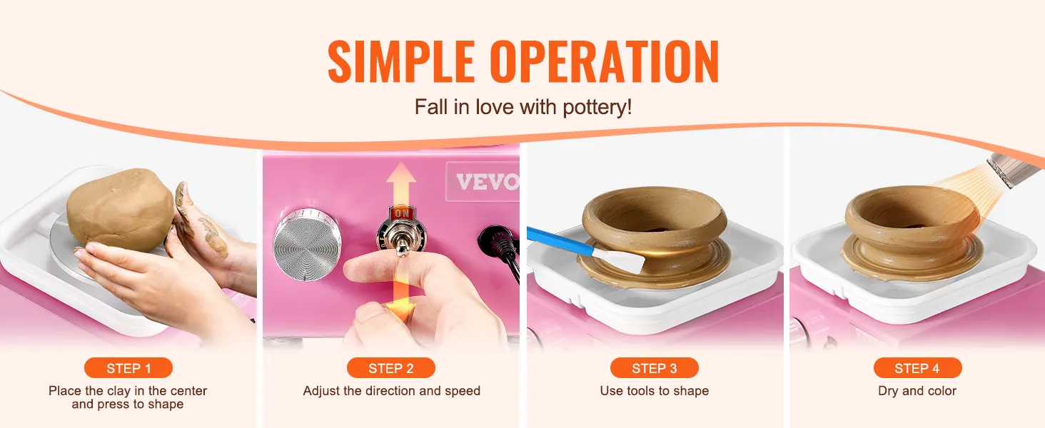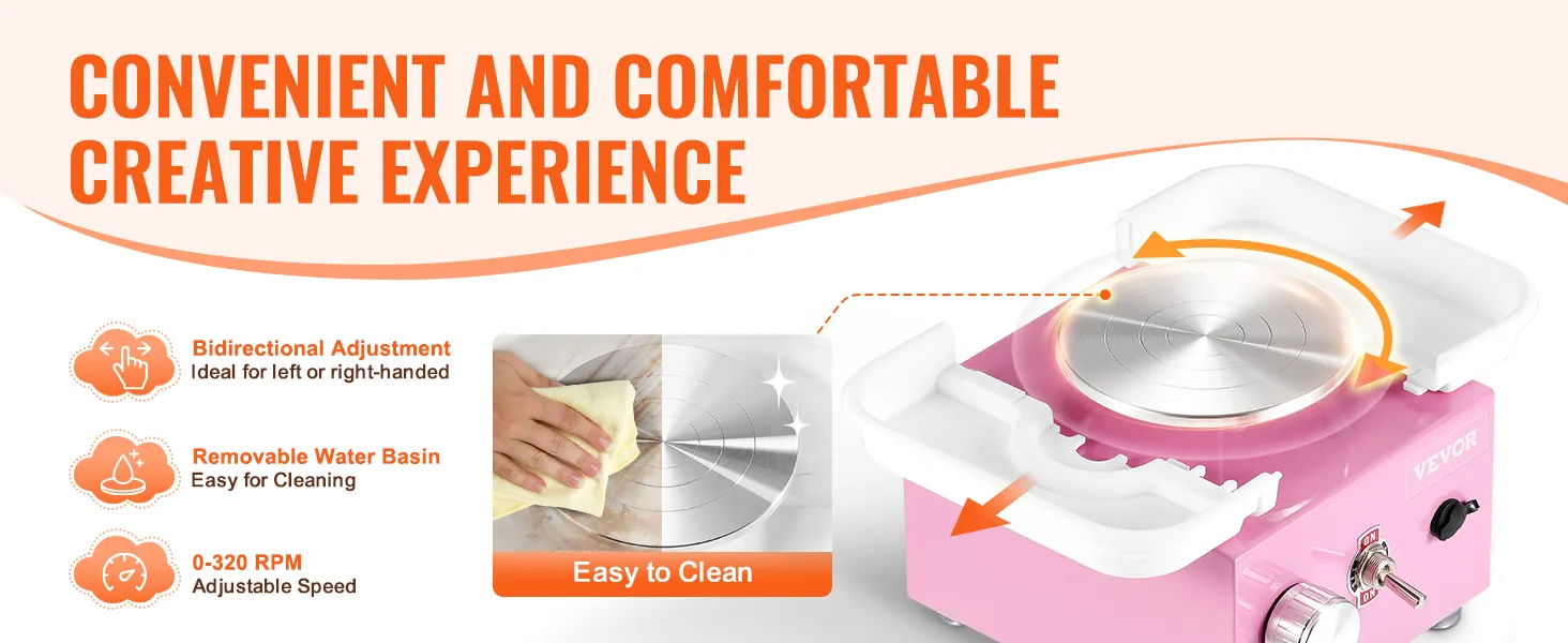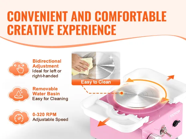Handige bediening: de pottenbakkersschijf heeft bidirectionele aanpassing en snelheidsregeling van 0 tot 320 tpm, waardoor hij zelfs voor beginners gemakkelijk te gebruiken is. Met een geluidsniveau van ≤ 55 dB biedt hij een rustige en comfortabele creatieve omgeving waarin u uw creativiteit de vrije loop kunt laten.
