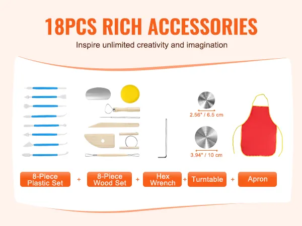 Complete gereedschapsset: deze pottenbakkersschijf wordt geleverd met een complete gereedschapsset, bestaande uit een 8-delige snijset, een 8-delige plastic gereedschapsset en een waterdicht schort. Het voldoet aan al uw behoeften op het gebied van pottenbakken en is vooral geschikt voor beginners.