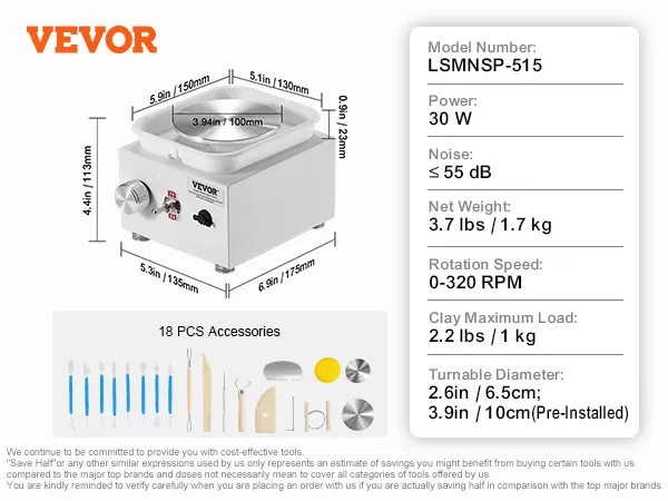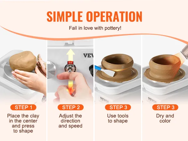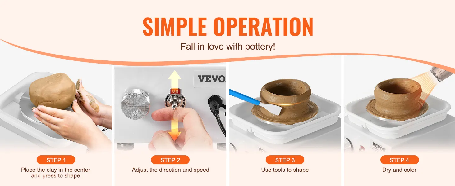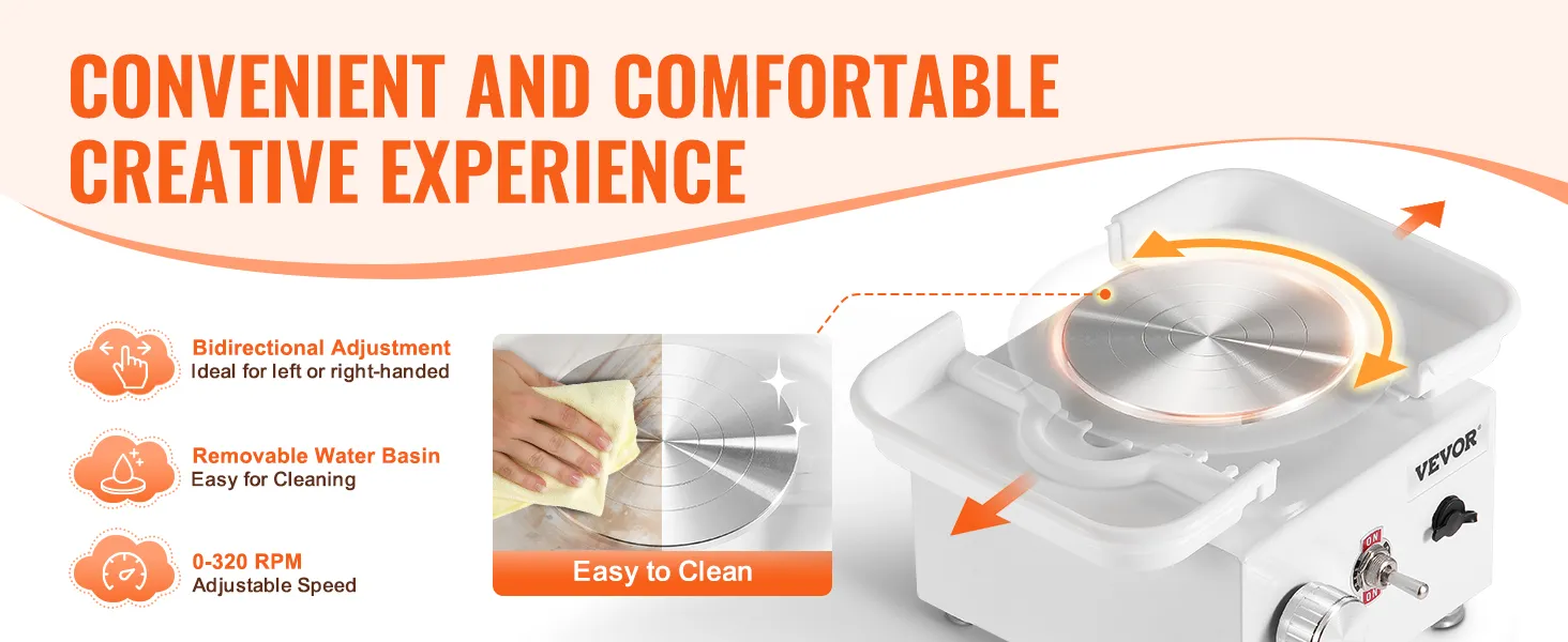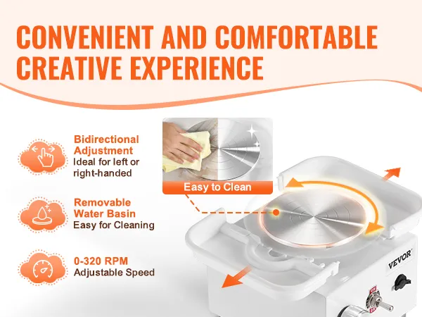 Handige bediening: de pottenbakkersschijf heeft bidirectionele aanpassing en snelheidsregeling van 0 tot 320 tpm, waardoor hij zelfs voor beginners gemakkelijk te gebruiken is. Met een geluidsniveau van ≤ 55 dB biedt hij een rustige en comfortabele creatieve omgeving waarin u uw creativiteit de vrije loop kunt laten.