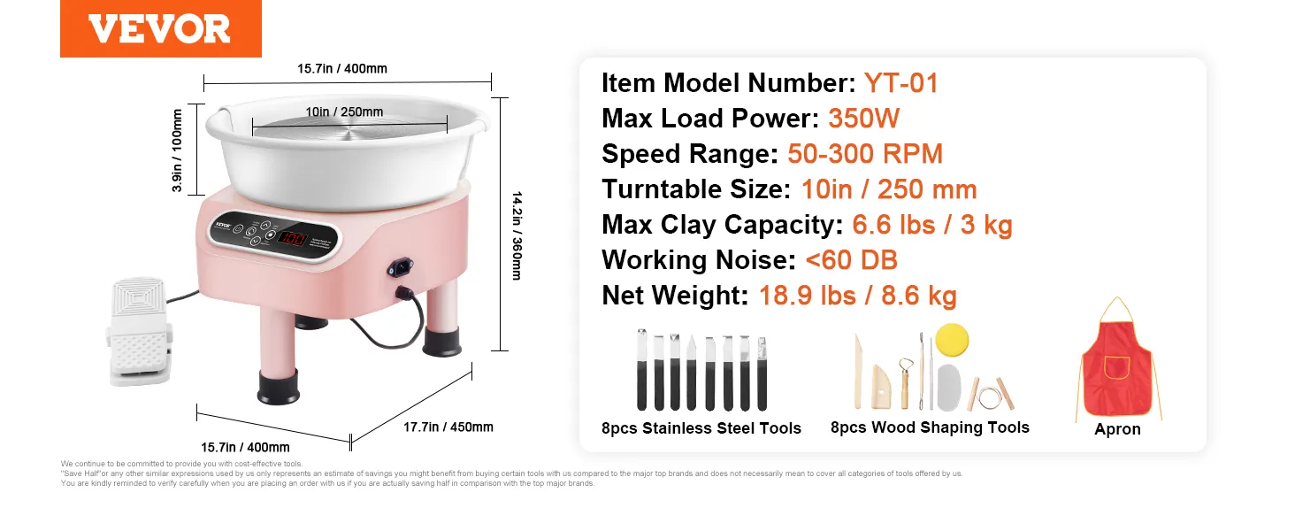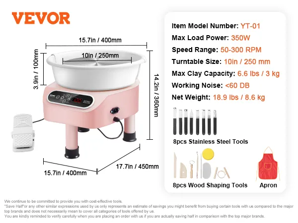 Professionele 17-delige gereedschapsset: onze draaitafel wordt geleverd met een 17-delige gereedschapsset, die 8 roestvrijstalen gereedschappen, 8 houten gereedschappen en een waterdicht schort bevat. Of u nu een studioprofessional, een klasleraar of een doe-het-zelver bent, deze machine is de ideale keuze.