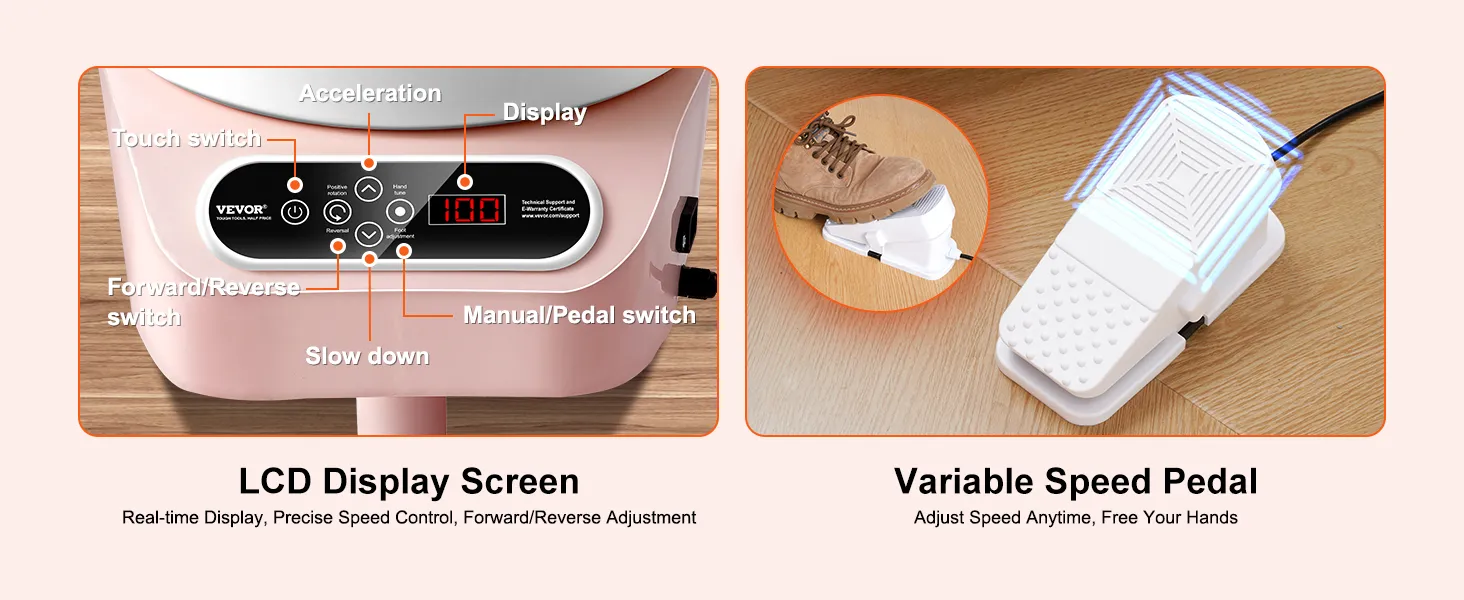 Comfortabele bediening: het tweesnelhedensysteem van onze keramische schijf maakt een flexibele bediening mogelijk. Met het moderne LCD-scherm kun je de voorwaartse en achterwaartse rotatie en snelheid nauwkeurig regelen en je aardewerkreis precies beginnen zoals jij dat wilt. Dankzij het pedaal met variabele snelheid hebt u uw handen vrij om u op uw creatie te concentreren.