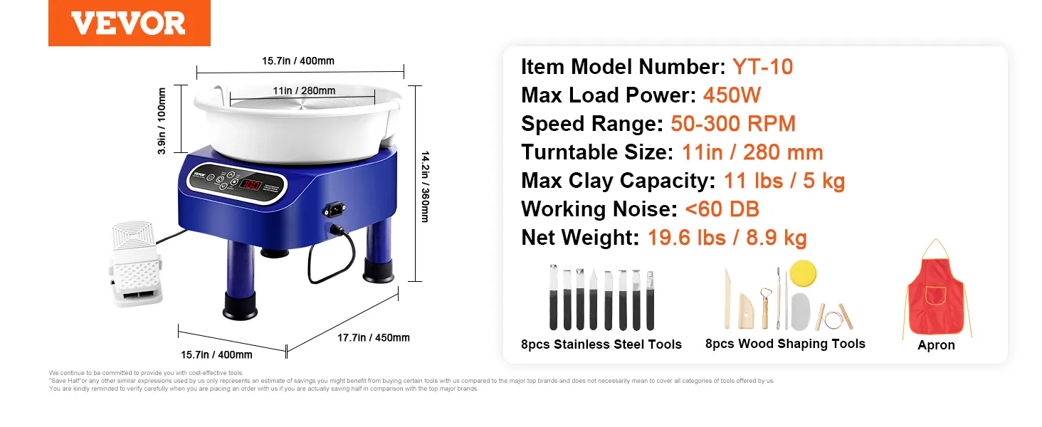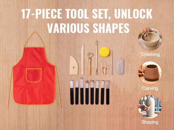 Professionele 17-delige gereedschapsset: onze draaitafel wordt geleverd met een 17-delige gereedschapsset, die 8 roestvrijstalen gereedschappen, 8 houten gereedschappen en een waterdicht schort bevat. Of u nu een studioprofessional, een klasleraar of een doe-het-zelver bent, deze machine is de ideale keuze.