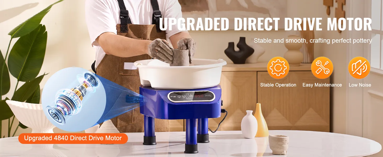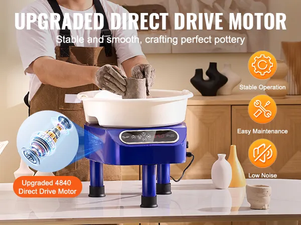 Hoge stabiliteit: onze pottenbakkersschijf is uitgerust met een moderne motor met directe aandrijving. Het biedt uitstekende stabiliteit bij zowel lage als hoge snelheden, vermindert onregelmatige vormen of vervorming tijdens het draaiproces en helpt u stukken van hoge kwaliteit te produceren.