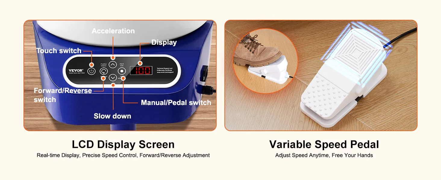 Comfortabele bediening: het tweesnelhedensysteem van onze keramische schijf maakt een flexibele bediening mogelijk. Met het moderne LCD-scherm kun je de voorwaartse en achterwaartse rotatie en snelheid nauwkeurig regelen en je aardewerkreis precies beginnen zoals jij dat wilt. Dankzij het pedaal met variabele snelheid hebt u uw handen vrij om u op uw creatie te concentreren.