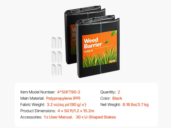 Weerbestendigheid: Dit onkruidwerende doek van polypropyleen is ontworpen om zijn vorm te behouden, zelfs onder wisselende weersomstandigheden zoals zonlicht, regen en smeltende sneeuw. Het materiaal voorkomt scheuren, veroudering en vervorming, waardoor betrouwbare prestaties in diverse gangbare tuinomgevingen gegarandeerd zijn.