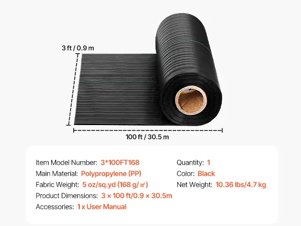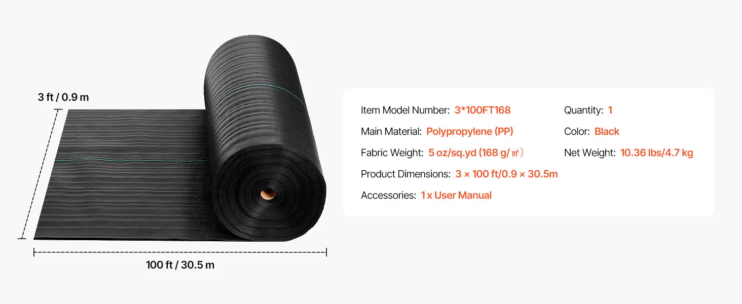 VEVOR Onkruidbestrijdingsdoek 0,9 x 30,5 m Tuinvlies 168 g/m², Polypropyleen Onkruidmat, Onkruidbarrière met hoge ventilatie en drainage, Wortelbarrière voor kassen, boerderijen en tuinen, Zwart