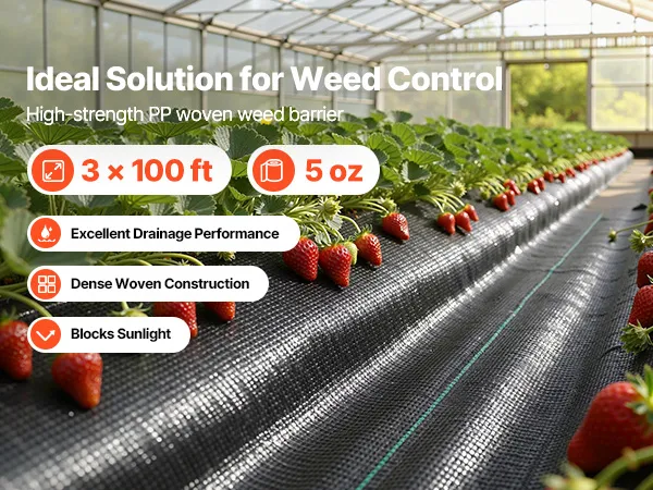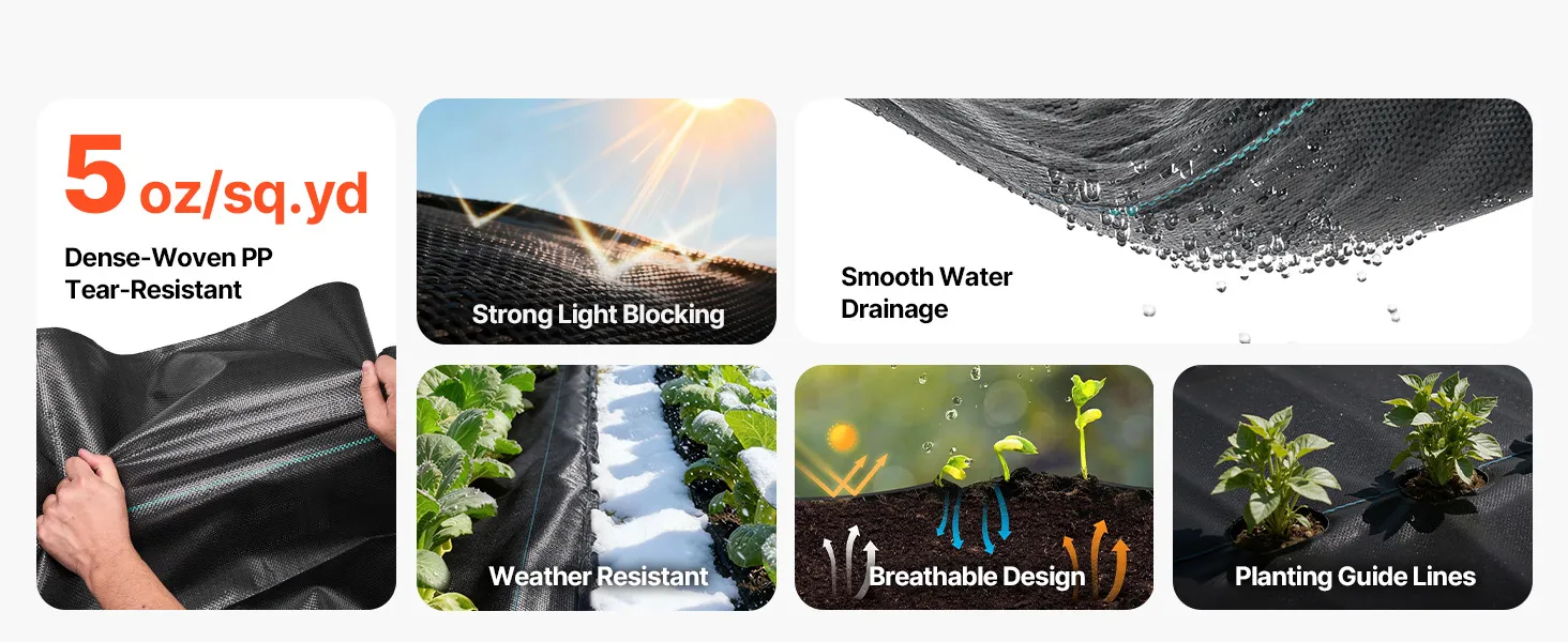 Evenwichtige luchtcirculatie: Dankzij het PP-weefsel met gelijkmatige micro-openingen laat dit VEVOR-onkruidbestrijdingsdoek water, lucht en voedingsstoffen vrij door de grond circuleren. Het voorkomt wateroverlast en bodemverdichting en bevordert de lucht- en watercirculatie, waardoor de wortelgroei van planten optimaal wordt ondersteund.