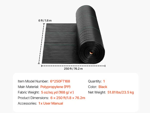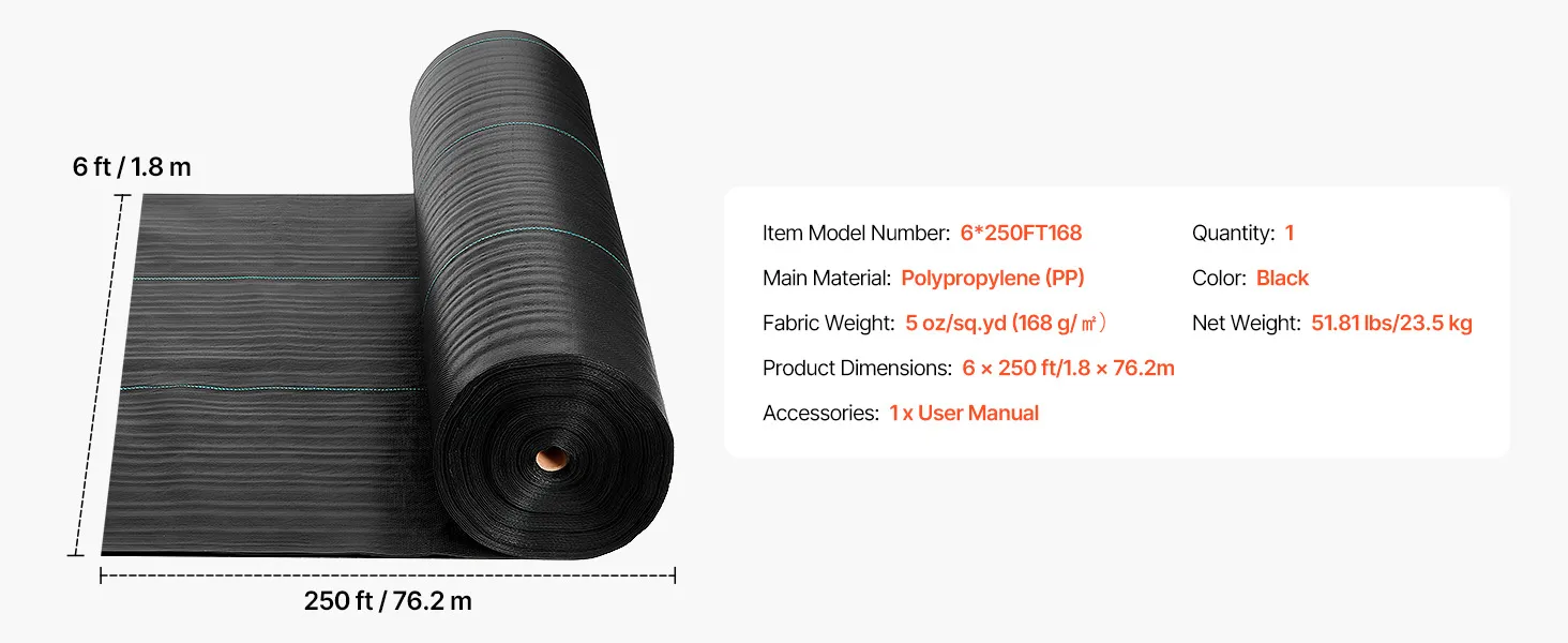 VEVOR Onkruidbestrijdingsdoek 1,8 x 76,2 m Tuinvlies 168 g/m², Polypropyleen Onkruidmat, Onkruidbarrière met hoge ventilatie en drainage, Wortelbarrière voor kassen, boerderijen en tuinen, Zwart